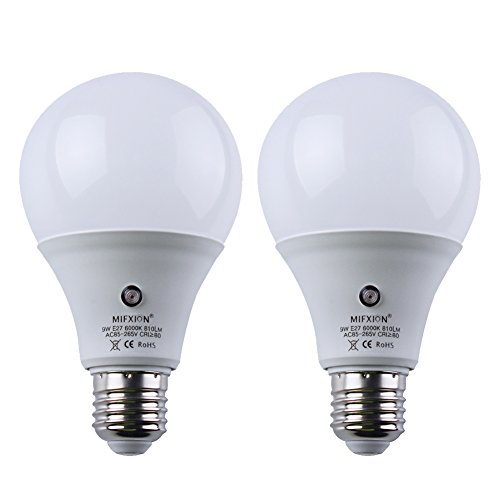 2-Pack E27 Dusk to Dawn LED Sensor Light Bulbs Built-in Photosensor Detection Auto Switch Light Indoor/Outdoor Lighting Lamp for Porch Hallway Patio Garage (9W 810Lumens, Cool White 6000K)