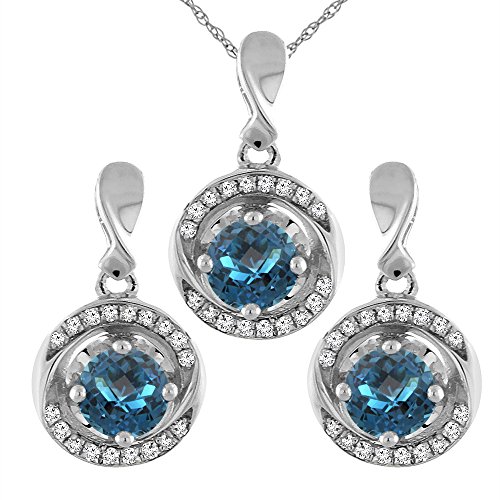 -. Binding : Jewelry -. Brand : Sabrina Silver -. Department : womens -. Feature : 14K Solid Gold / Naturally-vibrant, superior quality color gemstone / High Quality Genuine Diamond Accents / Complimentary gold chain included -. ProductGroup : Jewelry -. ProductTypeName : FASHIONOTHER -. Title : 14K White Gold Natural London Blue Topaz Earrings and Pendant Set with Diamond Accents Round 4 mm