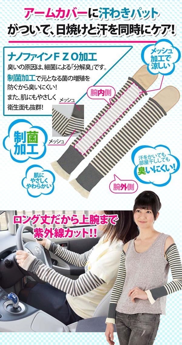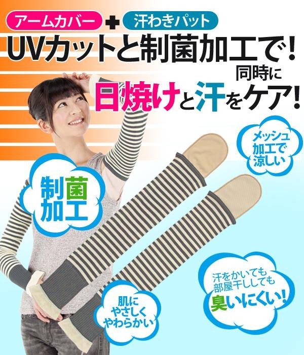 アームカバーに汗わきパットがついて、日焼けと汗を同時にケア。制菌加工で菌の増殖を防ぐから臭いにくい!!
