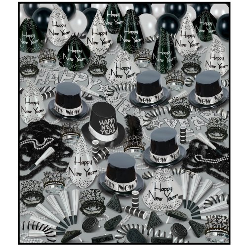 Studio : The Beistle Company Publisher : The Beistle Company Binding : Kitchen Product Description Beistle 88905BKS100 Silver Bonanza Assortment for 100 People. This assortment has enough items for 100 people to use. The assortment includes 1 bartender hi-hat, 1 plumed waitress tiara, 45 foil party hats, 5 plastic top hats, 50 glittered foil tiaras, 20 noisemakers, 80 foil horns, 25 party beads, 25 poly leis, 100 serpentine throws, 25 balloons and 1 glittered New Year streamer. 0