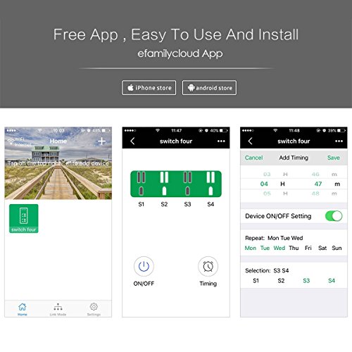 SEPARATELY CONTROL AND MOBILE DEVICES REMOTE CONTROL. This Wi-Fi smart power strip can be split into 4 smart Wi-Fi sockets! Each socket is independently controlled by Efamilycloud APP and Alexa Echo/Smart Home. The turn on/off status of each socket is shown clearly on the APP and there is also one indicator light beside each outlet. Once set up connection, smartphone/tablet can remotely control home electronics anytime and anywhere via APP in 2G/3G/4G/WIFI network.