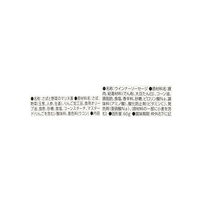 원재료:국산 구이 고등어의 향기 맛 야채 marine 85g:하면,야채(양파,(당근)인삼,생강)고, 사과 가공품,식용 올리브유,식식초,설탕,식염,콘 스타《지》,마스터 드(사과를 포함한다)/신맛료,착색료(《우콘》)/훈제조만 와 소시지 60g:돼지고기,결착재료(나오지 않겠 분,대두 단백)고, 콘유,돈지방,식염,향신료,설탕,《피로린》산Na,조미료(아미노산)고, 산화 방지제(비타민C)고, 발색 제(아질산Na)고,(원재료의 일부에 밀을 포함한다)