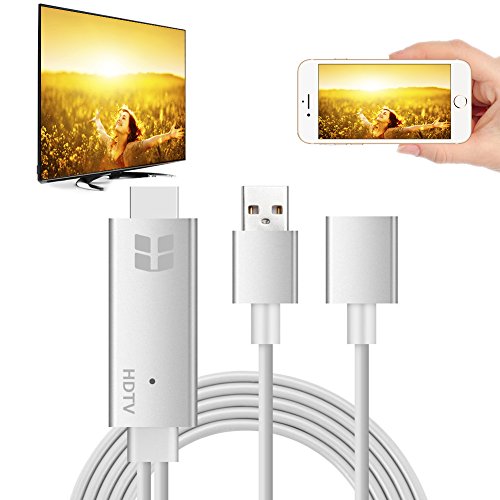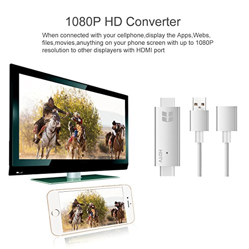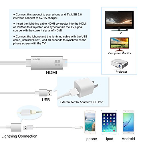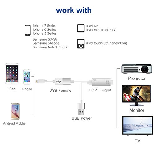 【Installation】 Step 1: Connect it: ● Insert the USB port into the 5V/1A adapter, or 5V/2A USB interface on the TV / Monitor or Projector. ● Insert the HDMI out port of onenuts cable into the HDMI Port of TV / Monitor or Projector. ● Insert the Original power cable of IOS devices/ Samsung phone / Huawei phone into USB female port of onenuts cable.