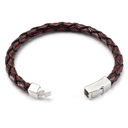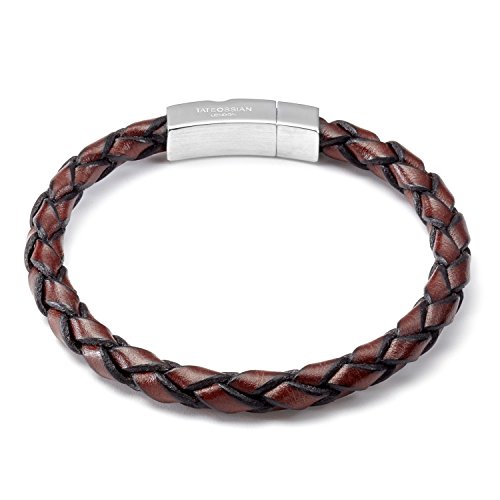 Tateossian Mens Single Wrap Scoubidou Brown Leather Bracelet with Silver Clasp, Large 19.5CM