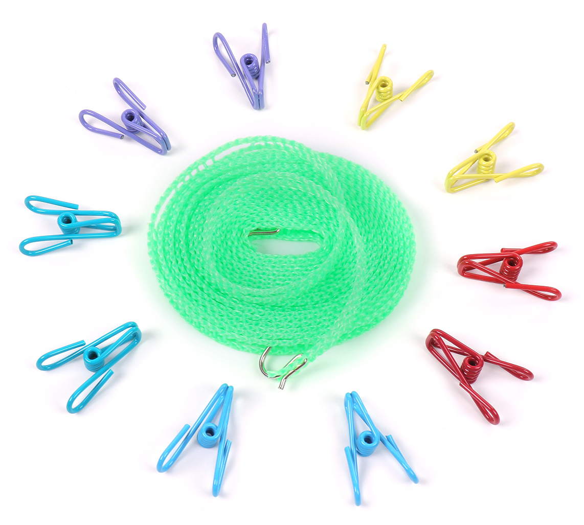 ・サイズ:洗濯バサミ/長さ5.5cm×幅1.8cm、ロープ/長さ5m 材質:洗濯バサミ/ステンレス、プラスティック ロープ/PE 重量:260g カラー:洗濯バサミ/ランダムでお届け ロープ/グリーン