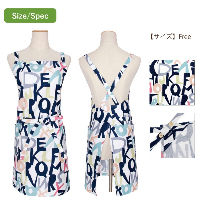 たくさんのアルファベットが散りばめられたポップでキャッチーなデザインのエプロンです。 ■サイズ フリー 着丈(胸元のレースから裾まで) : 約71cm  ウエスト : 約84cm 腰紐(片側): 約90cm ■材 質 綿100%