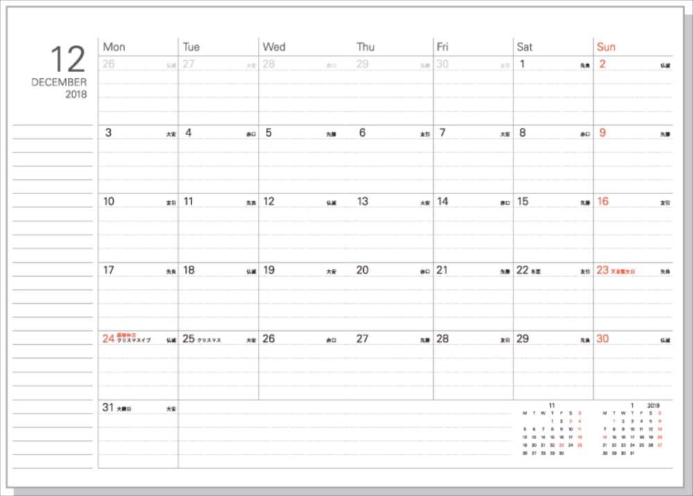 The monthly calendar is a block type beginning on Monday that enables you to grasp the schedule of a month at a glance.