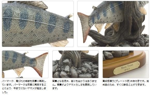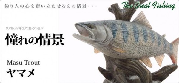 | 大自然のなかで楽しむ釣り。その情景は釣り人の心を奮い立たせます。リニューアルしたリアルフィギュアコレクションのヤマメは、釣り人の目線から、風景までもリアルに再現しています。魚を際立たせる流木、岩は魚と一体になり、見事なシーンを演出しています。 |