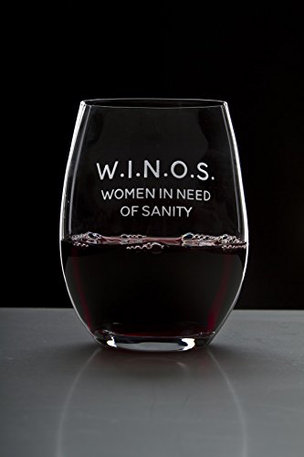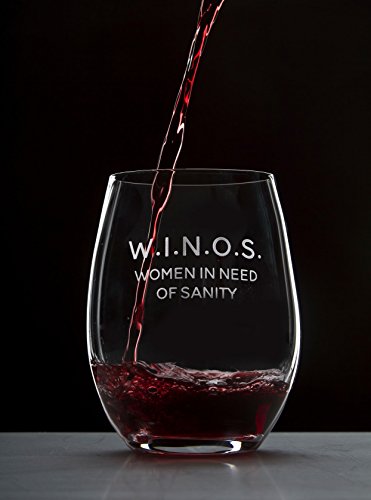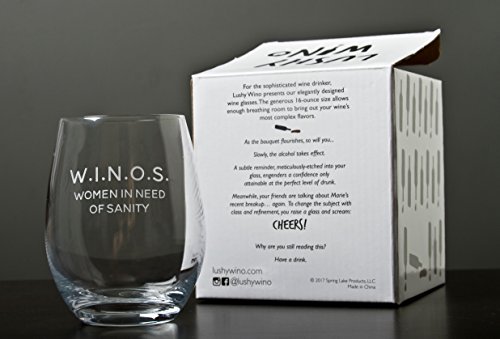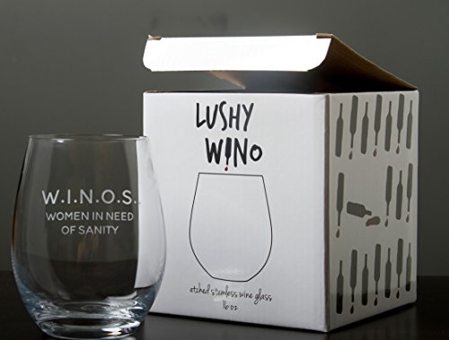 Studio : Lushy Wino Publisher : Lushy Wino Product Description The perfect wine glass for the wine lover in your life! "W.I.N.O.S. Women In Need Of Sanity." A gentle reminder, meticulously etched (not printed) into the glass so that it never wears off, that will add a sense of refinement and humor to every occasion. Its generous 16-ounce size allows wine to breathe and fully develop the rich bouquet of flavors you would expect from fine crystal. Yet, this wine glass makes for a great reasonably priced gift! This isn't a cheap novelty gift. This is fine, dishwasher-safe glassware that is perfect for use as your daily wine glass. All Lushy Wino glasses are individually boxed and protected. The carefully etched text will never wear off with heavy washing. This wine glass makes for a humorous and useful gift that will keep your girlfriends, moms, sisters, bachelorettes, bridesmaids, colleagues, enemies, former lovers and even Janet from Accounting thinking of you for years to come. Wine not buy one now? Cheers! 0