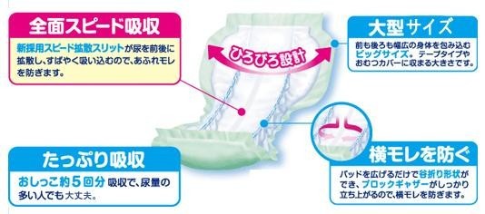 | スピード拡散スリットが尿を前後に拡散し、すばやく吸い込むので、あふれモレを防ぎます。 |