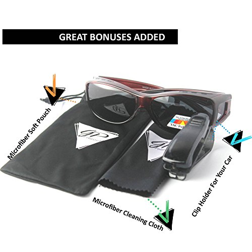 • FIT ON TOP OF REGULAR GLASSES: With the GREAT PICK FITOVER GLASSES SUNGLASSES you can put them over most large prescription glasses and take them off instantly without waiting for tempered lenses to adapt to the light changes; available in four frame choices and two lens choices, also included is a microfiber drawstring pouch, soft cleaning cloth, special car holder clip to keep safe of your sunglasses or eyeglasses in the car .