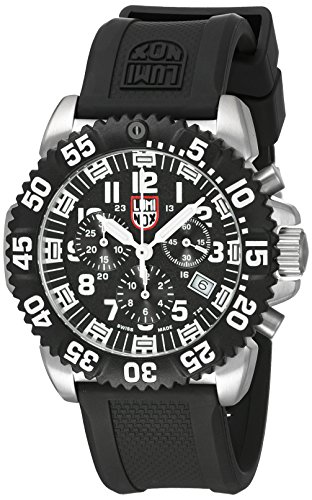 -. Feature : Featuring self-powered illumination through Luminox Light Technology (LLT), this watch exhibits a new height in function. With tiny self-powered micro gas lights installed into the hands and hour markers, as used by the US Army, this timepiece tops them all. / Brushed stainless steel case, 44 mm case diameter, Screw-down case-back engraved with the Navy Seal insignia, Black carbon reinforced PC unidirectional rotating bezel with ice blue luminous night vision tube and white Arabic numerals / Black dial with the Luminox signature logo, White hands and 24 hour Arabic numeral display, Ice blue luminous night vision tubes on the hands and hour markers with a yellow luminous night vision tube at the 12 o'clock position / Small seconds sub-dial at the 3 o'clock position, Date window at the 4 o'clock position, Chronograph function includes a sweep second hand, 30 minute counter at the 9 o'clock position and 12 hour counter at the 6 o'clock position / Special hardened mineral crystal, Screw-down crown, Swiss quartz movement, Ronda caliber 5030.D, Water resistant to 20 ATM/200 meters/660 feet, Black rubber strap, Pin buckle