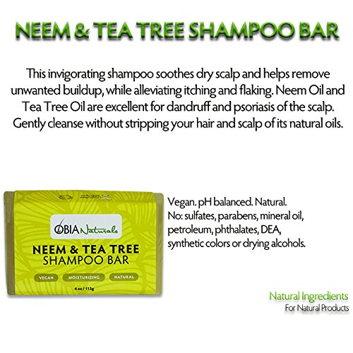 -. Binding : Misc. -. Brand : OBIA Natural Hair Care -. EAN : 0852456004244 -. Feature : Neem & Tea Tree Shampoo Bar - 4oz / Gently cleanse without stripping your hair and scalp of its natural oils / soothes dry scalp and helps remove unwanted buildup, while alleviating itching and flaking / Suitable for sensitive skin and all hair textures / This cleansing shampoo is excellent for dandruff and psoriasis of the scalp -. Label : OBIA Natural Hair Care -. Manufacturer : OBIA Natural Hair Care -. MPN : 8.52456E+11 -. NumberOfItems : 1 -. PackageQuantity : 1 -. PartNumber : 8.52456E+11 -. ProductGroup : Beauty -. ProductTypeName : BEAUTY -. Publisher : OBIA Natural Hair Care -. Studio : OBIA Natural Hair Care -. Title : Shampoo Bar - Neem & Tea Tree Cleansing Wash - 4oz -. UPC : 852456004244