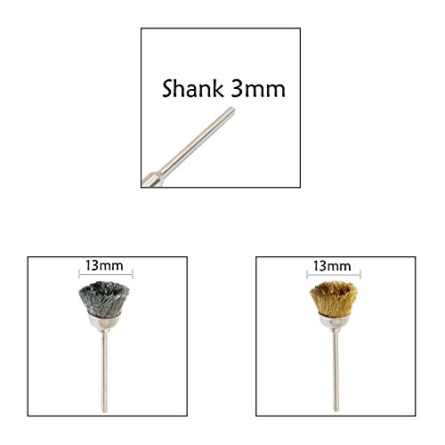 -. Feature : Shank diameter: 3 mm / New 40 Pieces wire brushes kit / Do not run in excess of 15,000 RPM / They will fit your hand drill, drill press & your Dremel and Foredom tool with a 3mm collet / Removes rust and corrosion - Use on items made of brass, copper, gold or other soft ferrous metals-such as tools, door knobs, automobile parts and electrical contacts