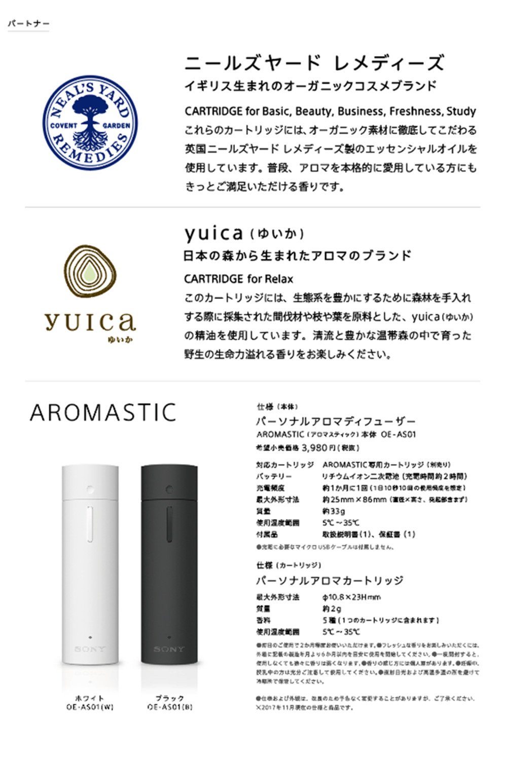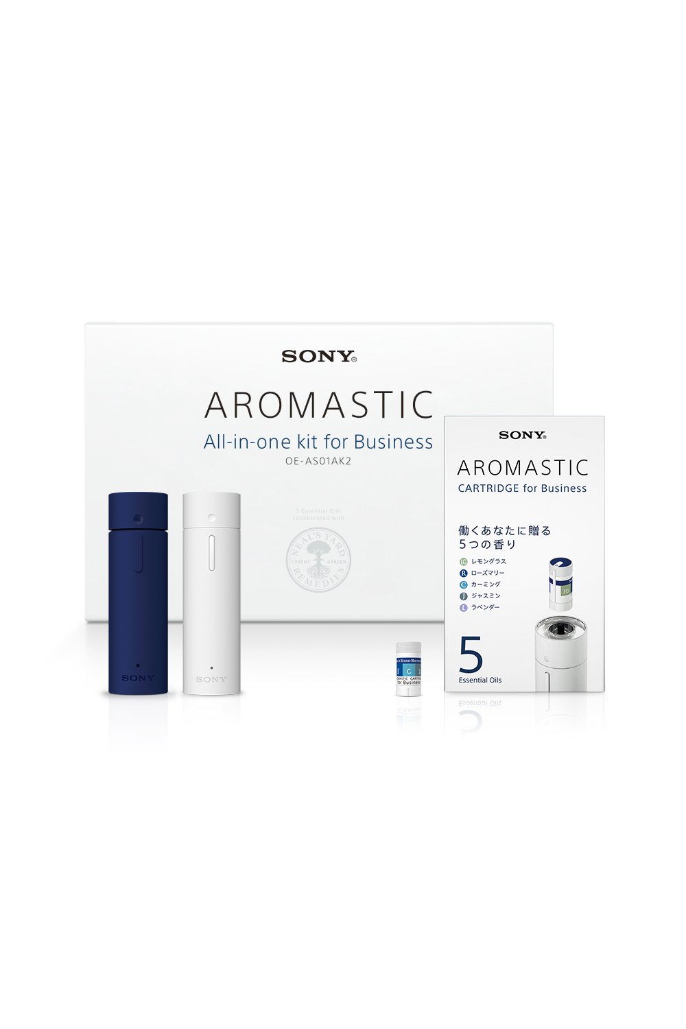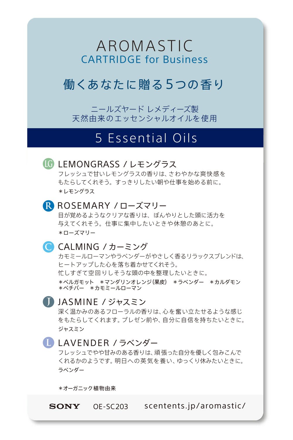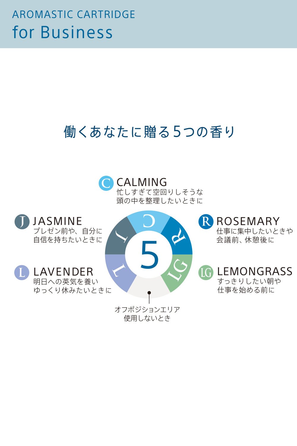 In AROMASTIC body, we set up three points of "AROMASTIC Cartridge for Business" packed with five fragrances (lemon grass, rosemary, carming, jasmine, lavender) snuggling closely to you who worked busy and blue silicon jacket.