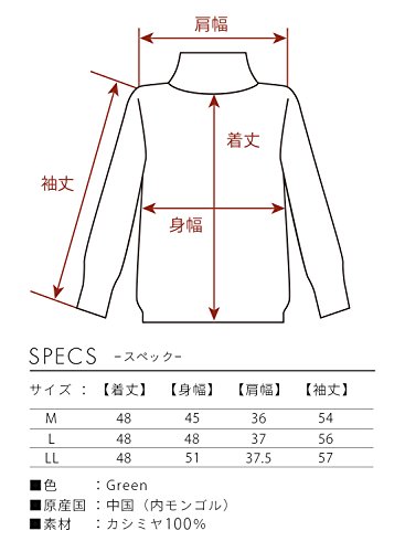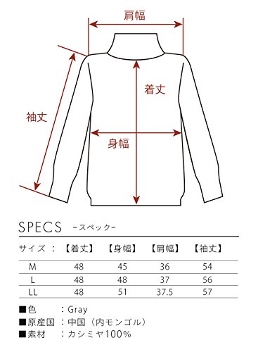 -. Feature : 【商品説明】 Mサイズ:着丈48cm 身幅45cm 肩幅36cm 袖丈54cm Lサイズ:着丈48cm 身幅48cm 肩幅37cm 袖丈56cm LLサイズ:着丈48cm 身幅51cm 肩幅37.5cm 袖丈57cm / 【お取り扱い方について】 細い繊維質の カシミヤ は非常にデリケートです。 日々お手入れ頂くことで、長くご愛用して頂けます。 着用時に関しましては、衣服やバッグなどとの摩擦、引っかかりにお気をつけください。 クリーニングにお出しになる際は、 カシミヤ クリーニングについて、クリーニング店にお聞きください。 / 【素材】最高級 カシミヤ100% / 【検査】安心の素材検査済(日本で実施)