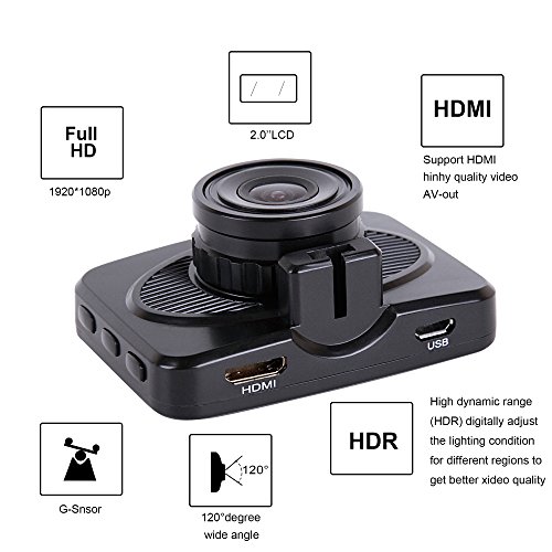 Full-HD Video 1920*1080 at 30 fps. Super wide 120° angle camera can automatically record hands-free in a continuous loop. Large 2.0" screen, slim design.