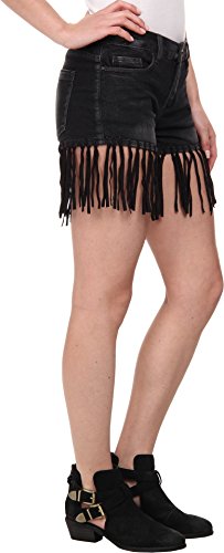 Denim shorts feature a high rise and mini length. Grey Area Anatomy is a faded black wash with 3-D whiskers, sanding, and a tied fringe that trims the cuffs. Leather brand patch at back waist. Inset rivet detail at back left pocket. Five-pocket design. Belt-loop waistband. Zip fly and button closure. 88% cotton, 12% spandex. Machine wash and tumble dry. Imported.