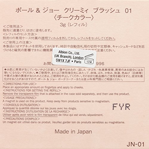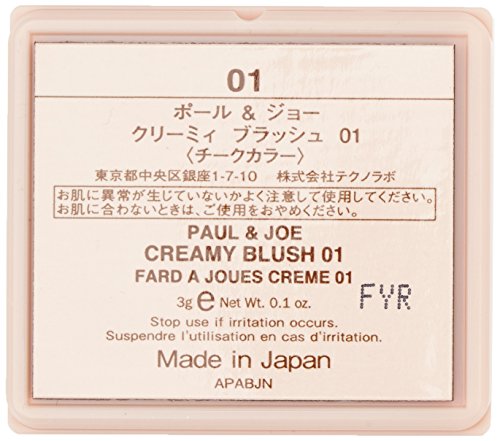 -. Binding : Health and Beauty -. Brand : PAUL & JOE -. EAN : 4969527158068 -. Feature : This solid base formulation effortlessly melts into skin for unbeatable color production. The unique Creamy Fit Base allows a lustrous layer to evenly cover the skin and deliver clear, luminous cosmetic results. / Formulated with full pigment powder coated with oil to cling to skin to prevent color from fading over time, for beauty that lasts for hours. / Directions: Take desired amount onto fingertip and apply to cheeks. Compact Sold Separately. -. Model : APABJN01 -. MPN : APABJN01 -. PackageQuantity : 1 -. PartNumber : APABJN01 -. ProductGroup : Beauty -. ProductTypeName : BEAUTY -. Title : Creamy Blush Refill Kitten (01) 0.1 oz by Paul & Joe