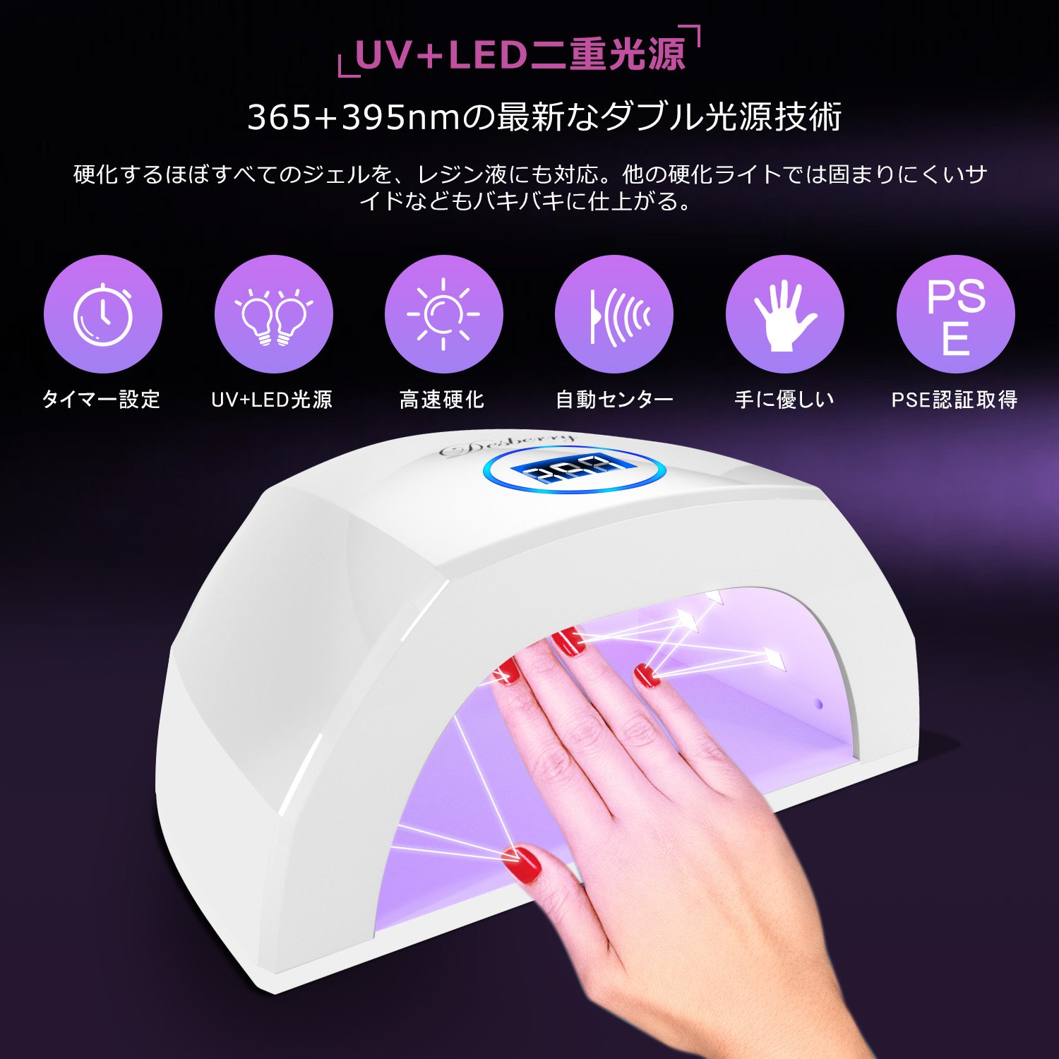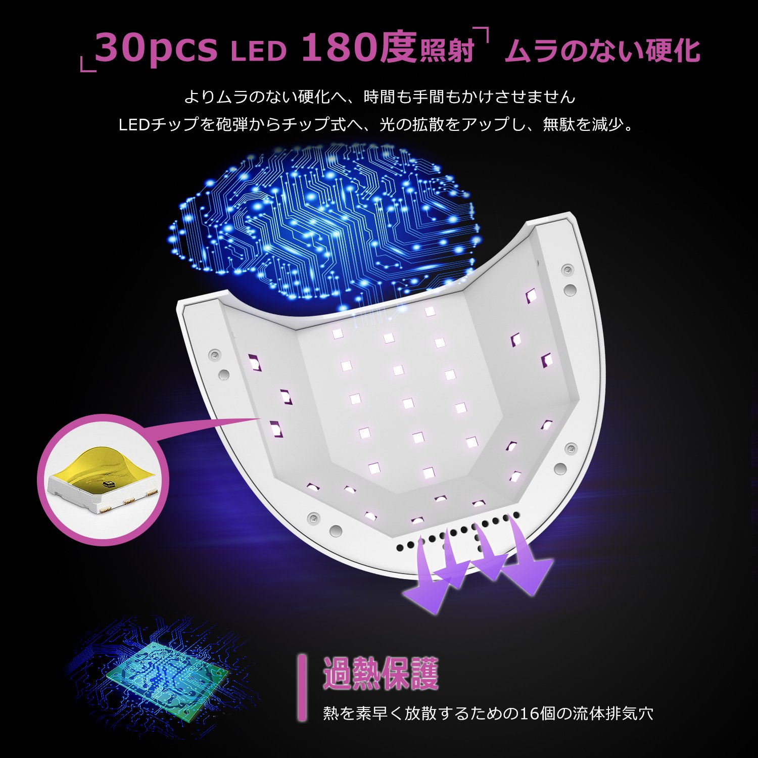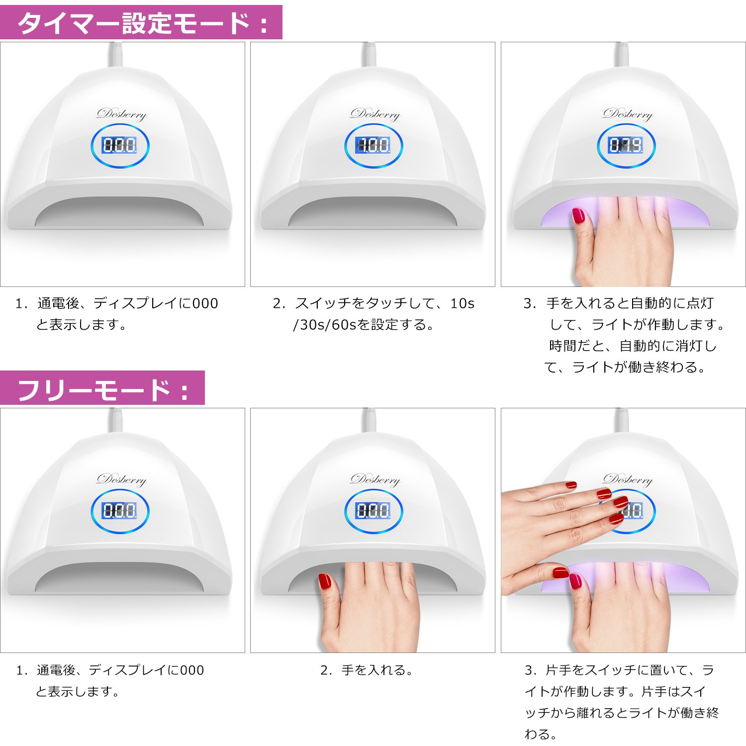 【超高速硬化】最速ダブル光源技術を採用するネイルドライヤーは48Wでハイパワーで、従来の品よりもムラなく素早く硬化できます。ネイルランプの光源の使用寿命も約50000時間に達します。肌に負担の多いCCFLは使用していませんが、人体に優しいLED(30pcs)の光を使用して皮膚の損傷を生じるし、手足に黒くになることは全然ないです。安心してお使いください。
