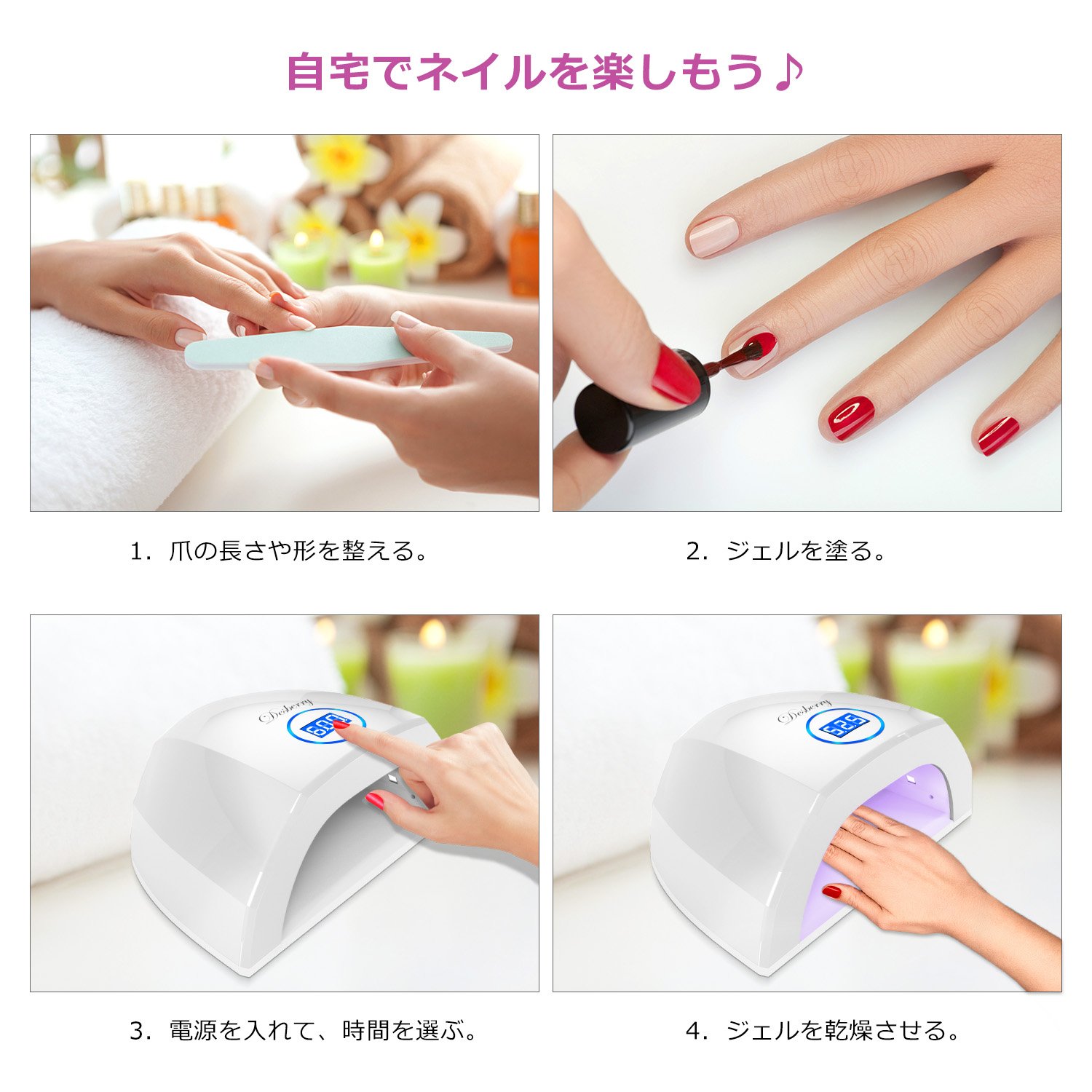 【UV+LED二重光源】ネイルドライヤーは365+395nmの最新なダブル光源技術を採用して、どんなジェルも、レジン液も、シャキっと硬化します。ネイルジェルを速く乾燥させることができます。自宅でもネイルサロンをお手軽に楽しむことができます。