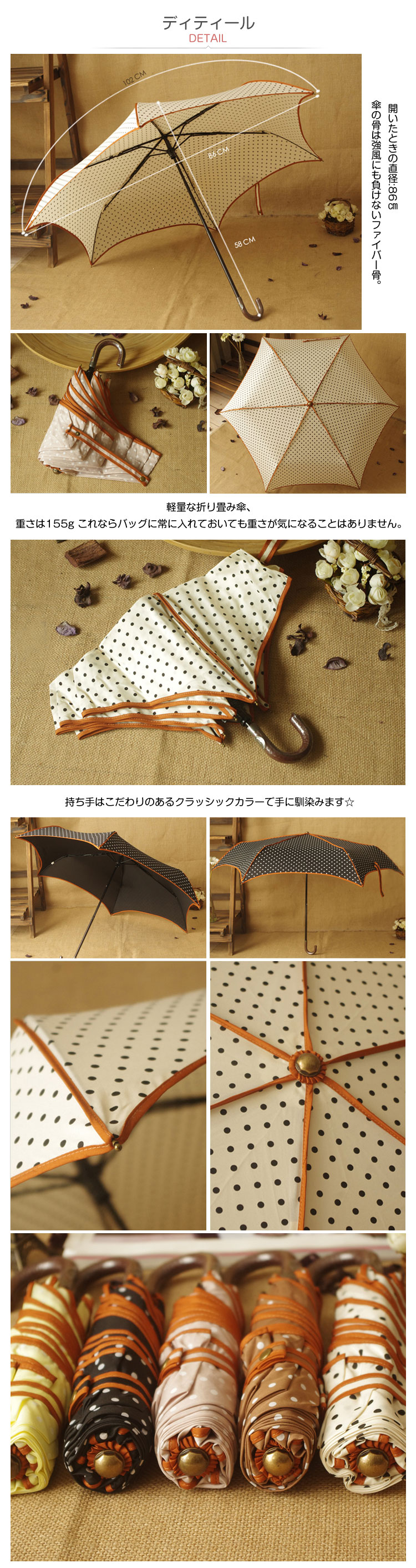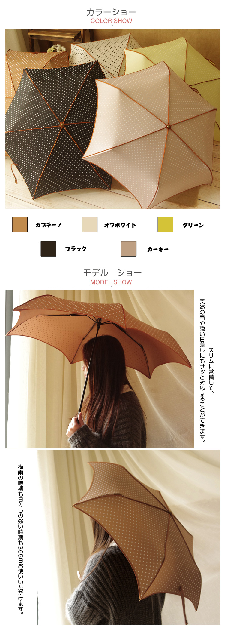 | 仕事でも日常でも使いやすいカラー5種類をご用意いたしました!軽量な折り畳み傘、重さは155g これならバッグに常に入れておいても重さが気になることはありません。スリムに常備して、突然の雨や強い日差しにもサッと対応することができます。傘だけでなく傘袋の細かなデザインもこだわりの一本。梅雨の時期も日差しの強い時期も365日お使いいただけます。 | |