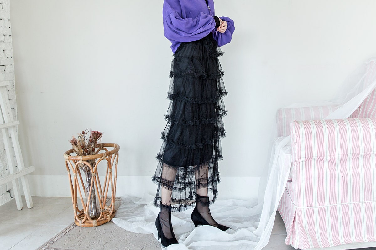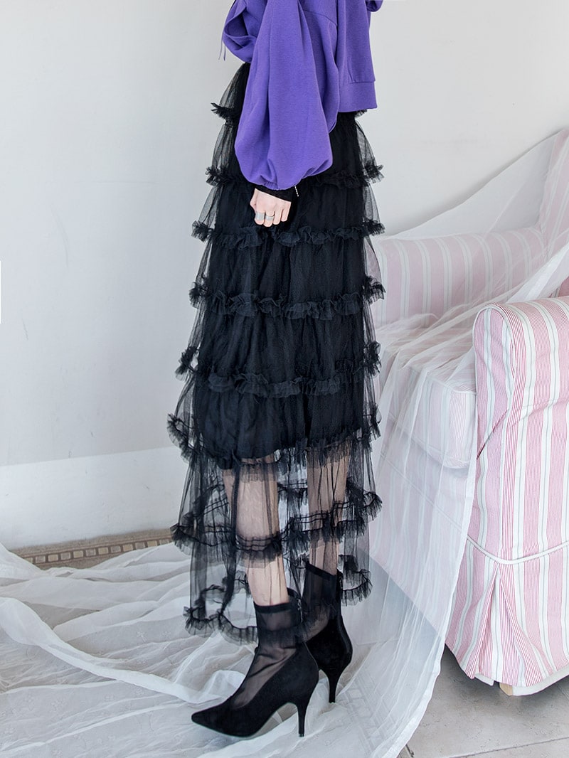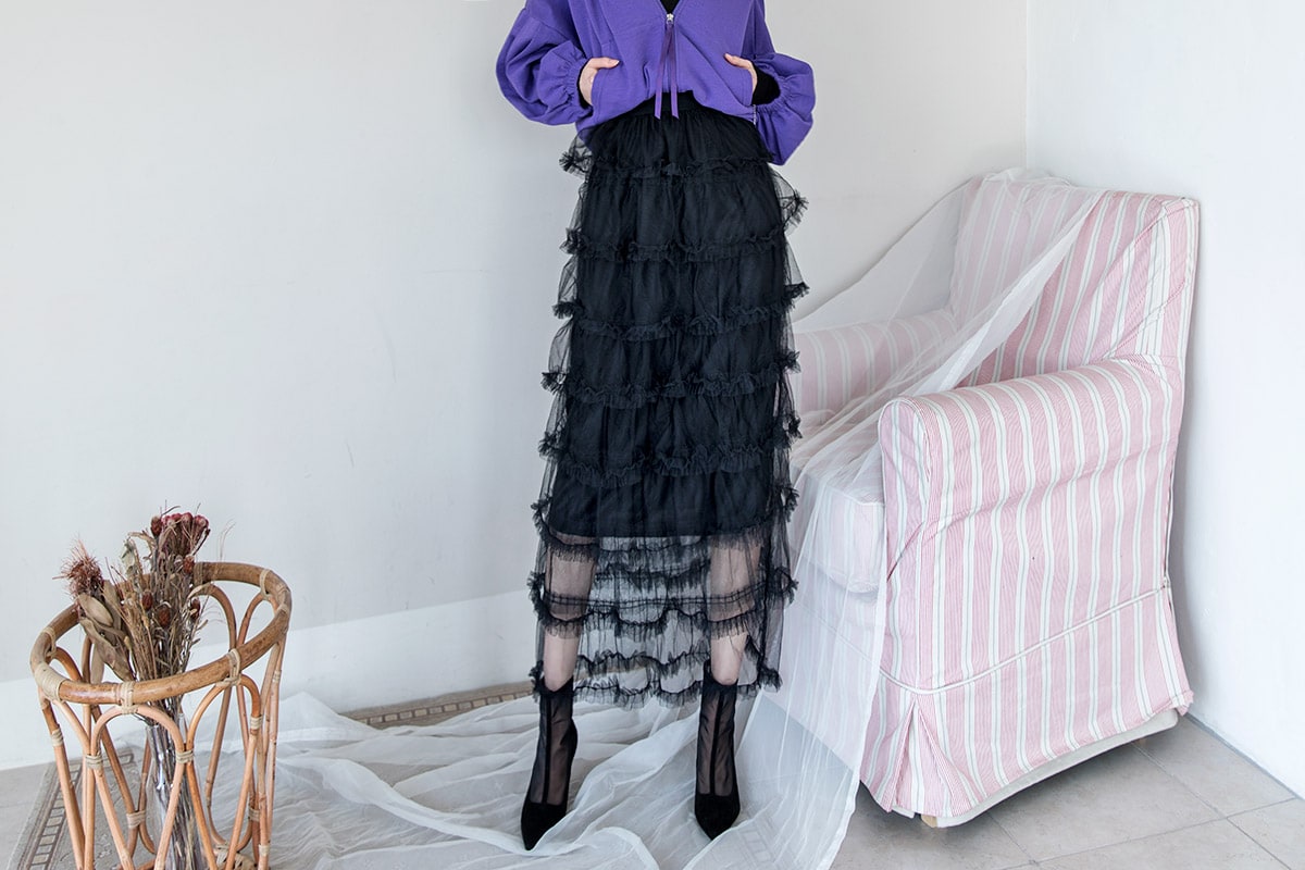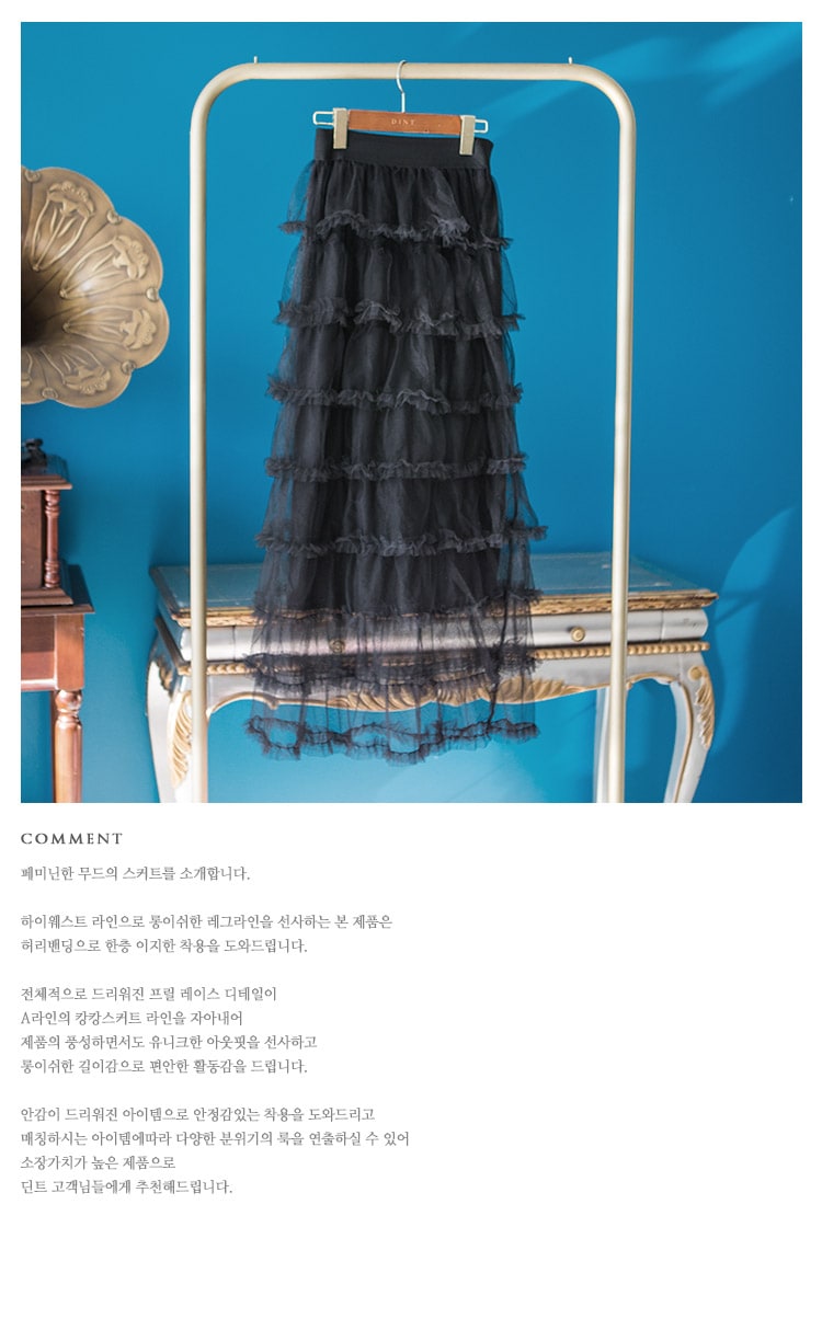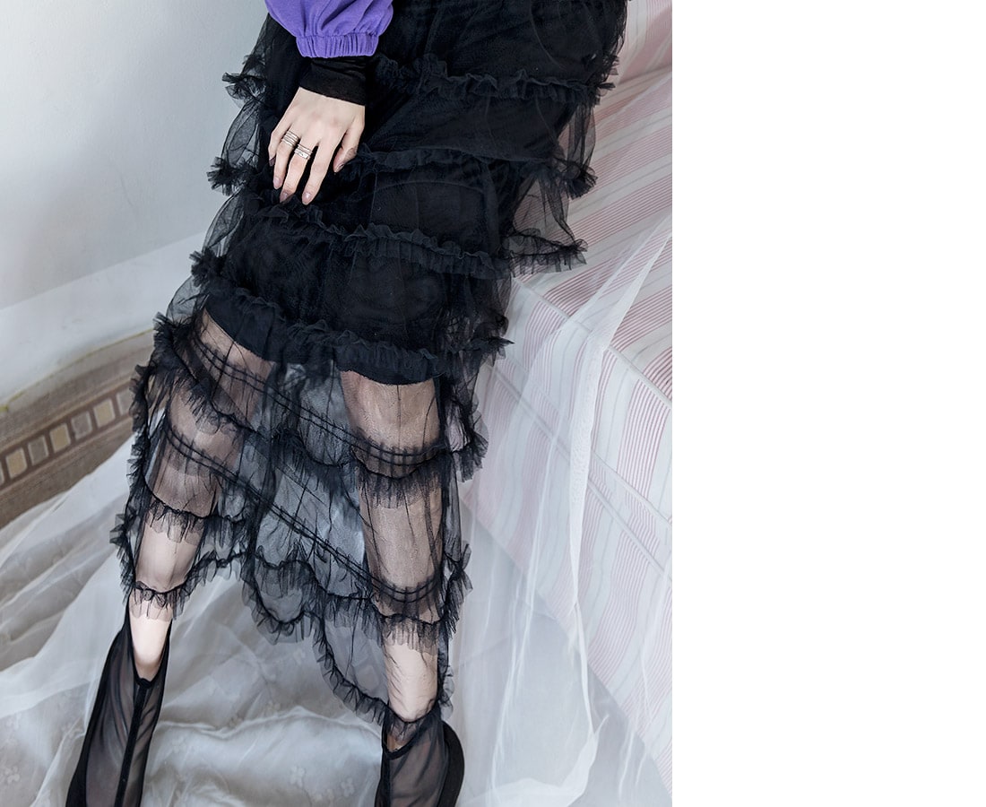 SK1644 드레이핑 시스루 라인 샤 스커트 Black