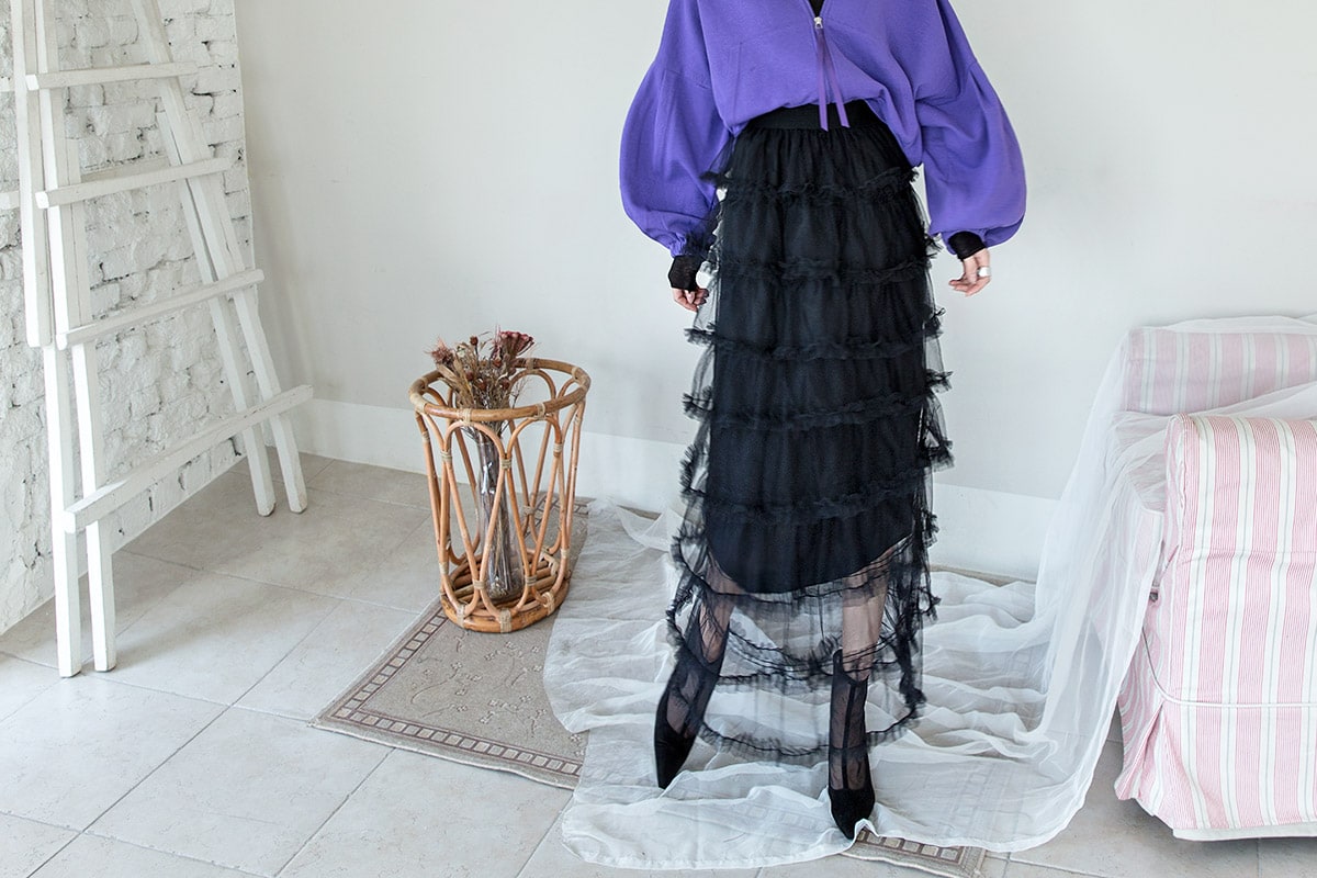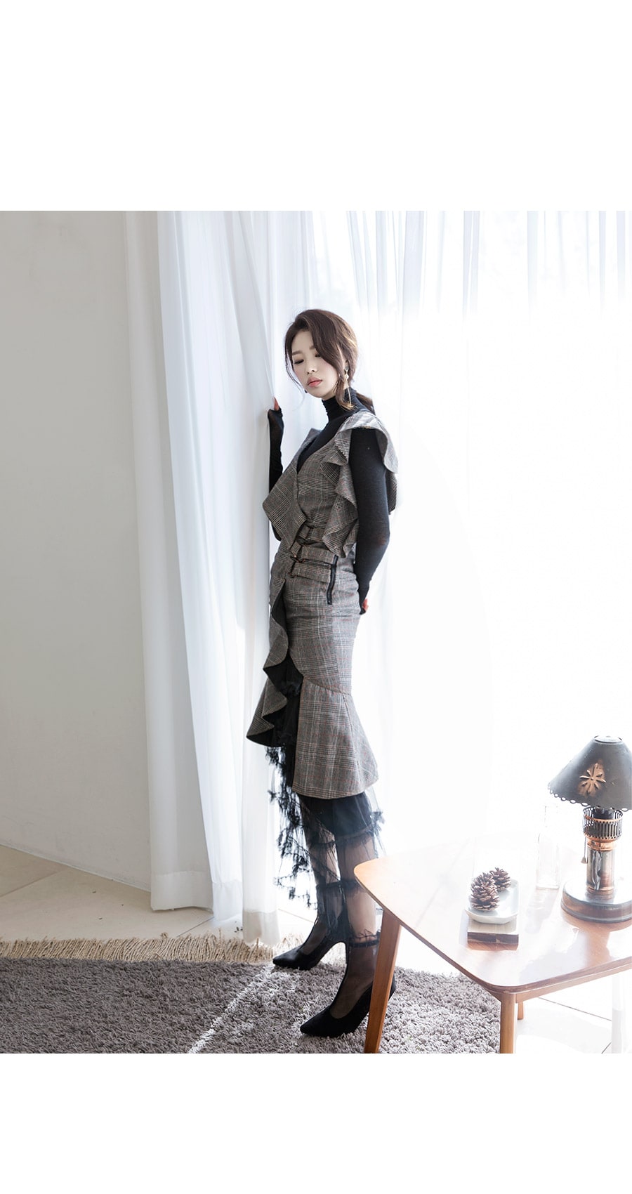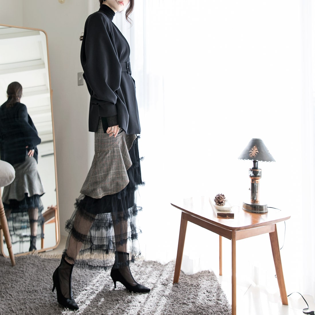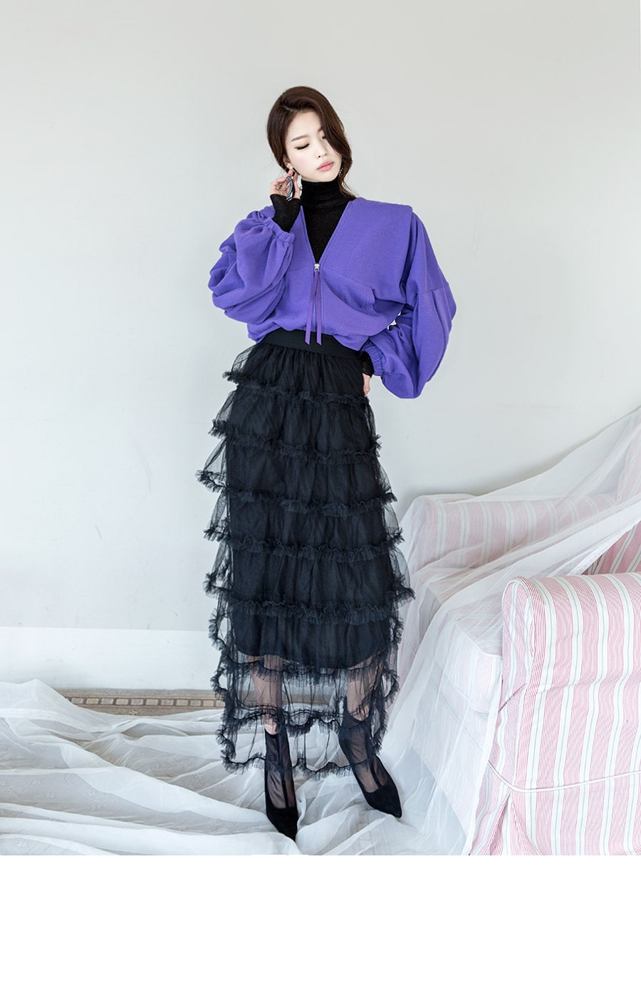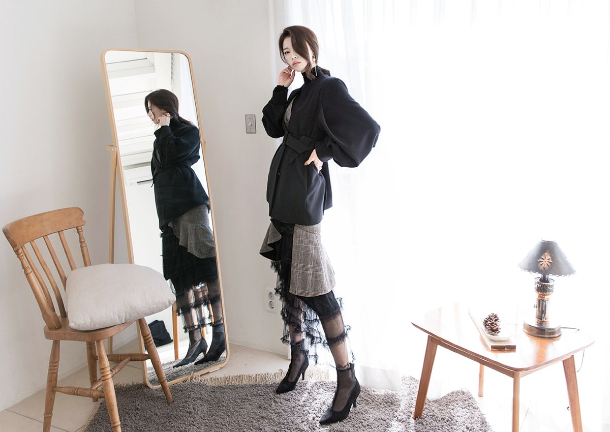 SK1644 드레이핑 시스루 라인 샤 스커트 Black