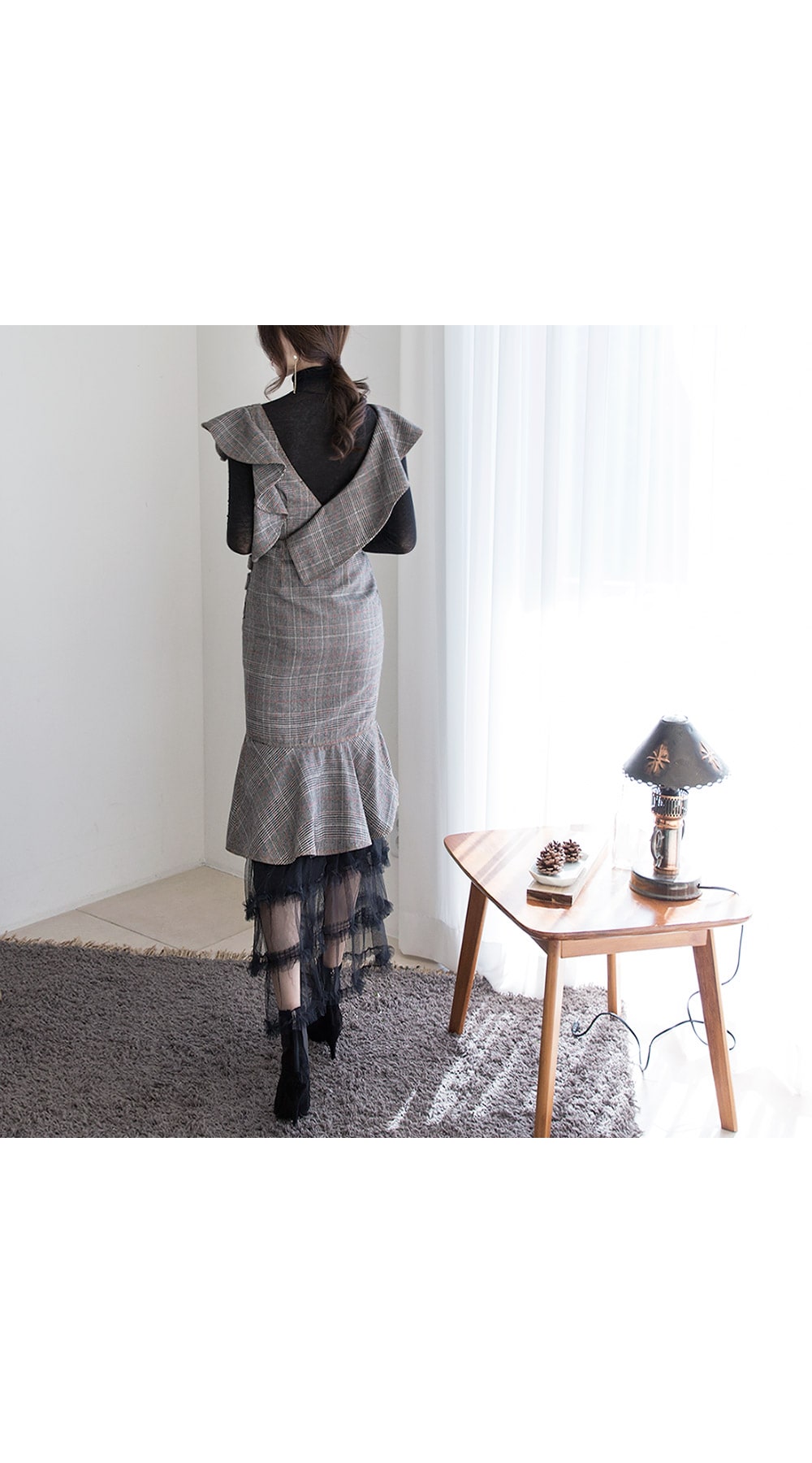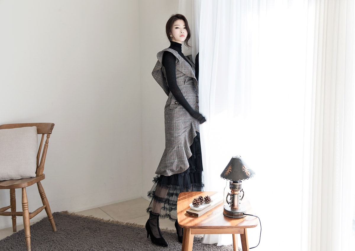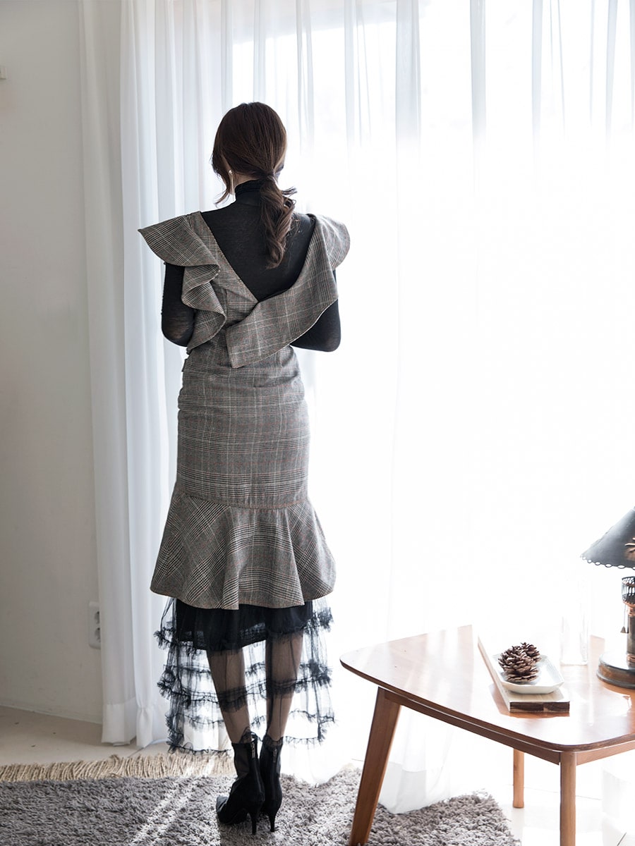 D3488 러플 사선 벨티드 체크 원피스 Brown check