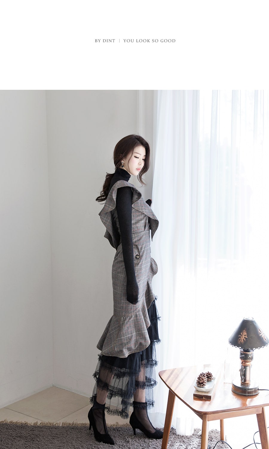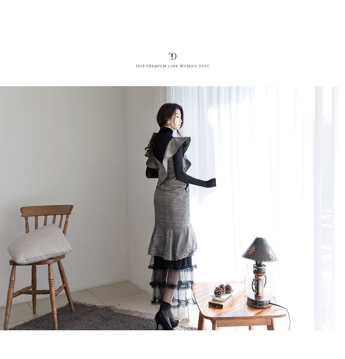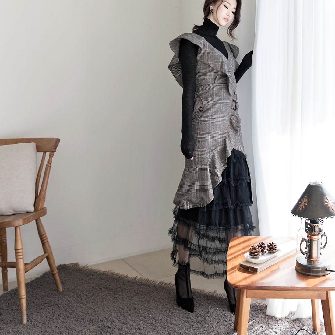 D3488 러플 사선 벨티드 체크 원피스 Brown check