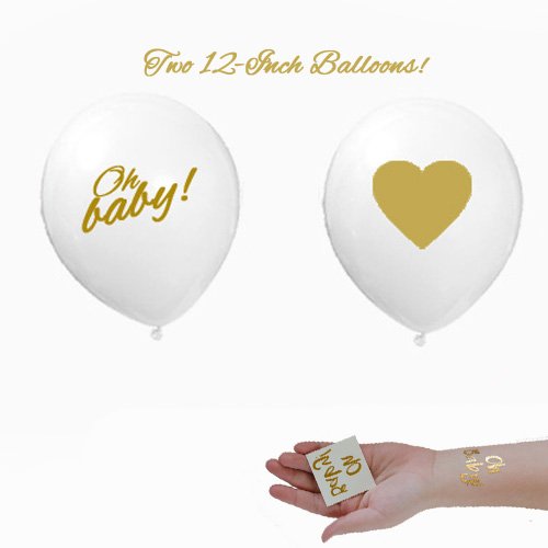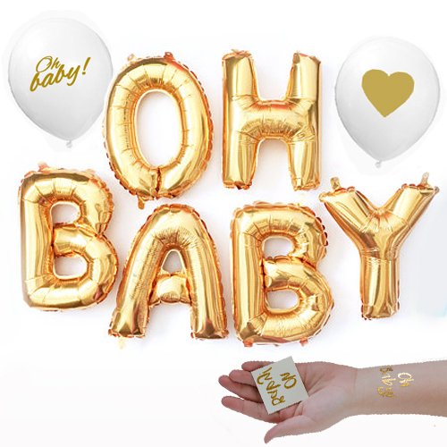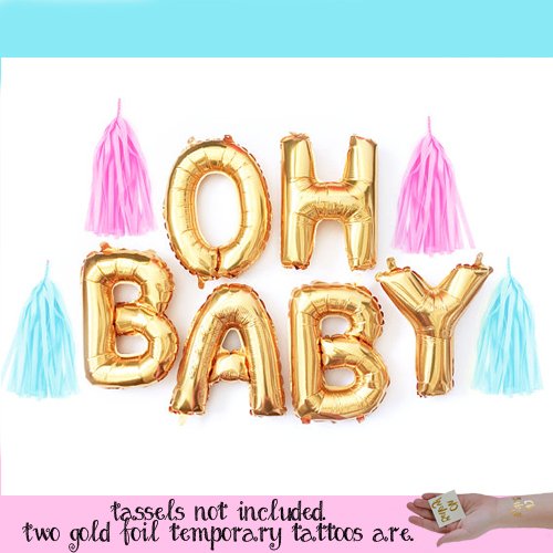 -. Binding : Toy -. Brand : Washunga Fun -. EAN : 0762444157473 -. Feature : This SET includes: Six- 16 inch Gold mylar balloon letters that spell out OH BABY / Two-2x2 Gold Foil Custom made Temporary Tattoos that are a beautiful Gold that says OH baby! / Two-12 inch white latex balloons. A gold heart on one and another says "Oh Baby!" ...these are the perfect addition to the gold mylar set! / Balloons ship flat and deflated. String and mini tassels not included / The "O" letter looks like a "C" when you get it and it is deflated. Add air to the balloon and it swells to be a "O" -. IsAdultProduct : 0 -. Label : Washunga -. Manufacturer : Washunga -. ProductGroup : Toy -. ProductTypeName : TOYS_AND_GAMES -. Publisher : Washunga -. Studio : Washunga -. Title : Gold OH BABY! Girl Boy Baby Shower Mylar Balloons Two Oh Baby Tattoos and two Gold lettering white balloons Decorations -. UPC : 762444157473