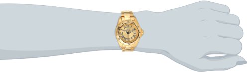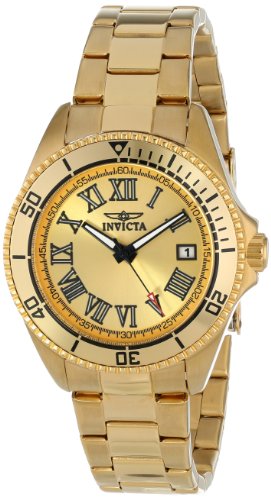 -. Binding : Watch -. Brand : Invicta -. Department : womens -. EAN : 0886678184149 -. Feature : Japanese quartz movement / Flame fusion crystal; 18k gold ion-plated stainless steel case and bracelet / Date window at 3:00 / Gold dial with black, red and white hands and black and white roman numerals; luminous; unidirectional 18k gold ion-plated stainless steel bezel / Water resistant to 330 feet (100 M): suitable for snorkeling, as well as swimming, but not diving -. Label : Invicta -. Manufacturer : Invicta -. Model : INVICTA-15094 -. MPN : INVICTA-15094 -. PackageQuantity : 1 -. PartNumber : INVICTA-15094 -. ProductGroup : Watch -. ProductTypeName : WATCH -. Publisher : Invicta -. ReleaseDate : 2013-12-17 -. Studio : Invicta -. Title : Invicta Women's INVICTA-15094 Pro Diver Analog Display Japanese Quartz Gold Watch -. UPC : 886678184149
