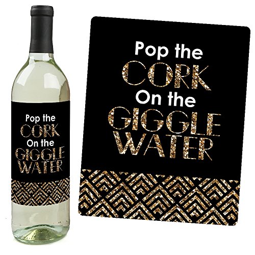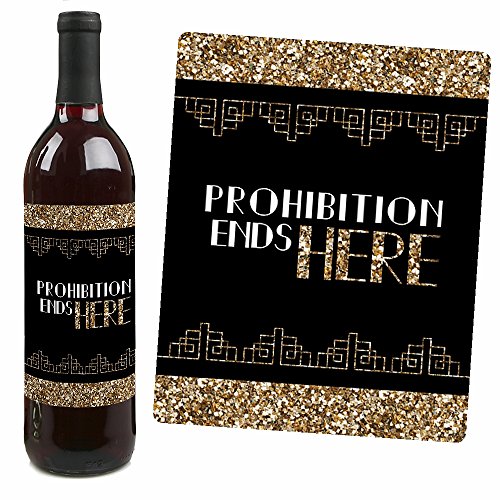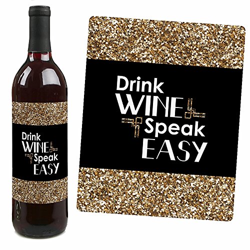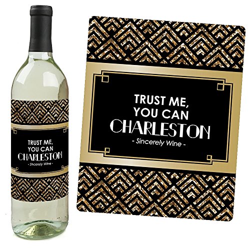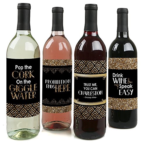 Wine bottle labels have the following sayings on the design: Pop the CORK On the GIGGLE WATER, PROHIBITION ENDS HERE, TRUST ME, YOU CAN CHARLESTON-Sincerely Wine-, DRINK WINE SPEAK EASY