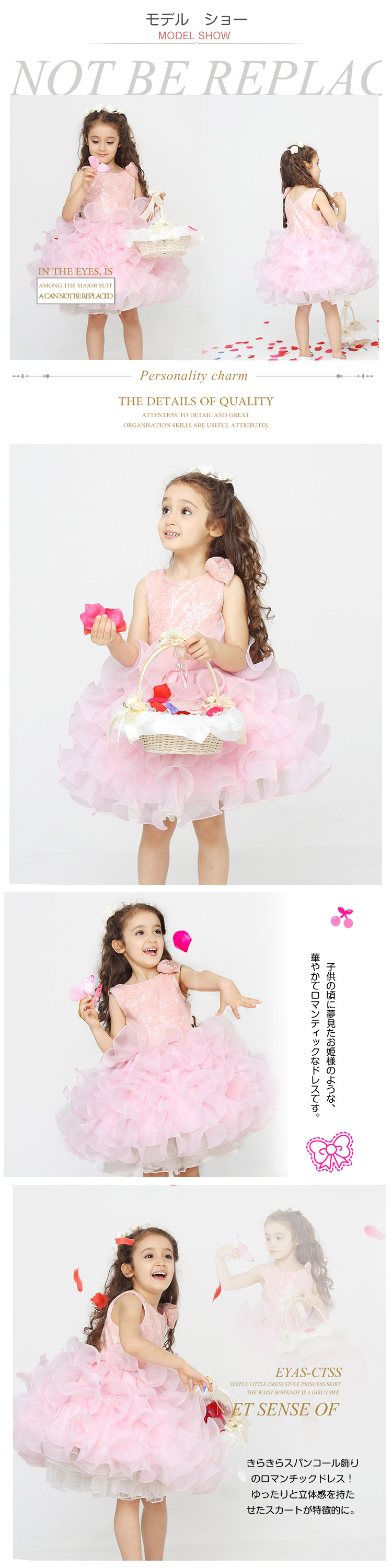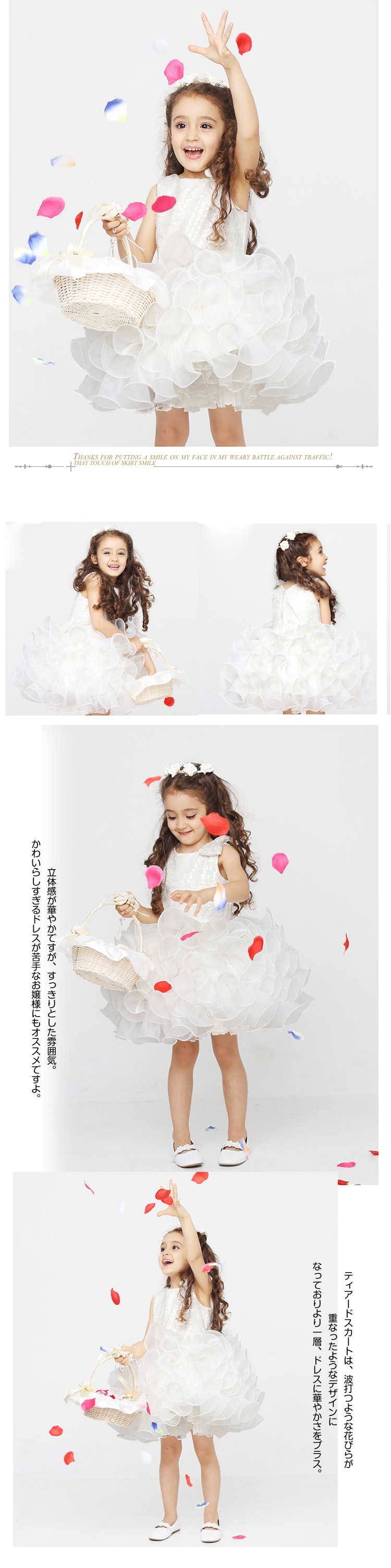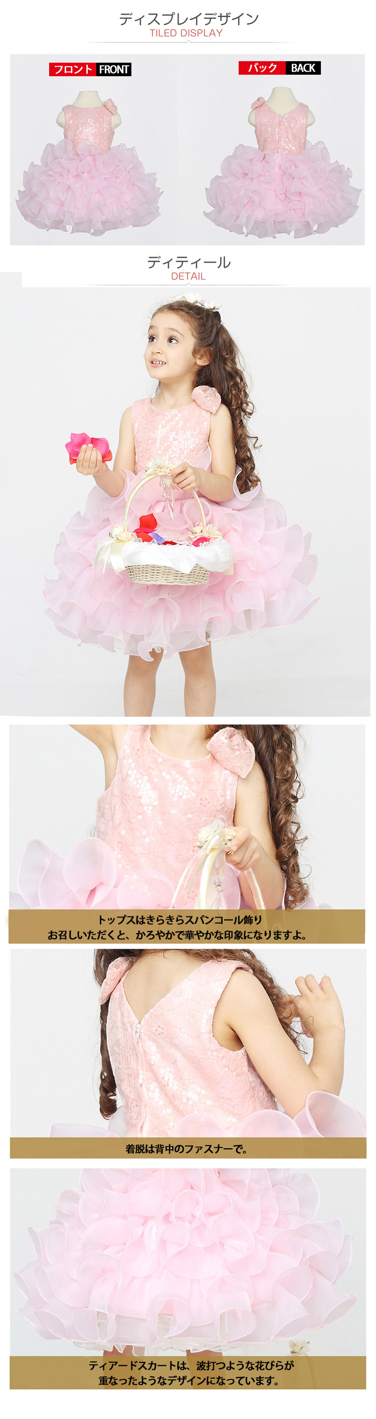 | 子供の頃に夢見たお姫様のような、華やかでロマンティックなドレスです。きらきらスパンコール飾りのロマンチックドレス!ゆったりと立体感を持たせたスカートが特徴的に。ティアードスカートは、波打つような花びらが重なったようなデザインになっておりより一層、ドレスに華やかさをプラス。立体感が華やかですが、すっきりとした雰囲気。かわいらしすぎるドレスが苦手なお嬢様にもオススメですよ。 | |