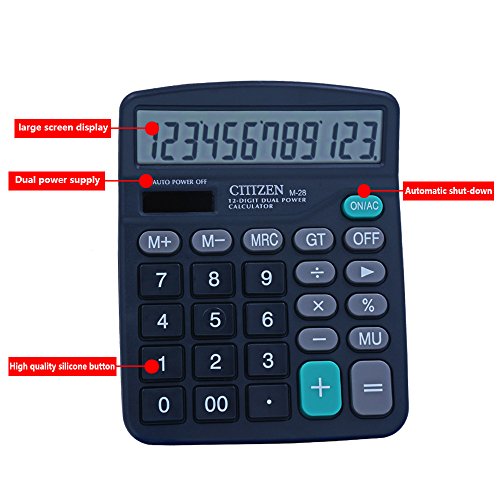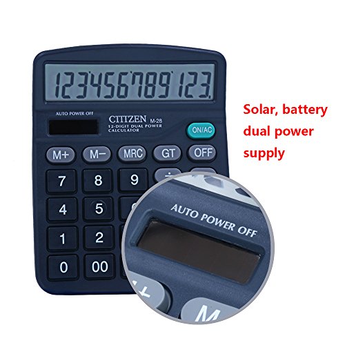 -. Feature : 1. Dual power: Basic calculator with solar and battery, solar function works even in the dim light. More convenience to useen in the dim light. More convenience to use(one AA battery NOT included) / 2. Office calculator with 12 digits LCD display design, vision more clearly / 3. Desktop calculator will be auto power off if you don't use it over 10 minutes. Energy saving and environental protection. / 4. Calculator with high quality plastic keys, more wear-resisting, not fade for a long time use . more clear and comfortable , enjoy your work. / 5. Calculator with high quality anti-slip mat, more stable and humanized