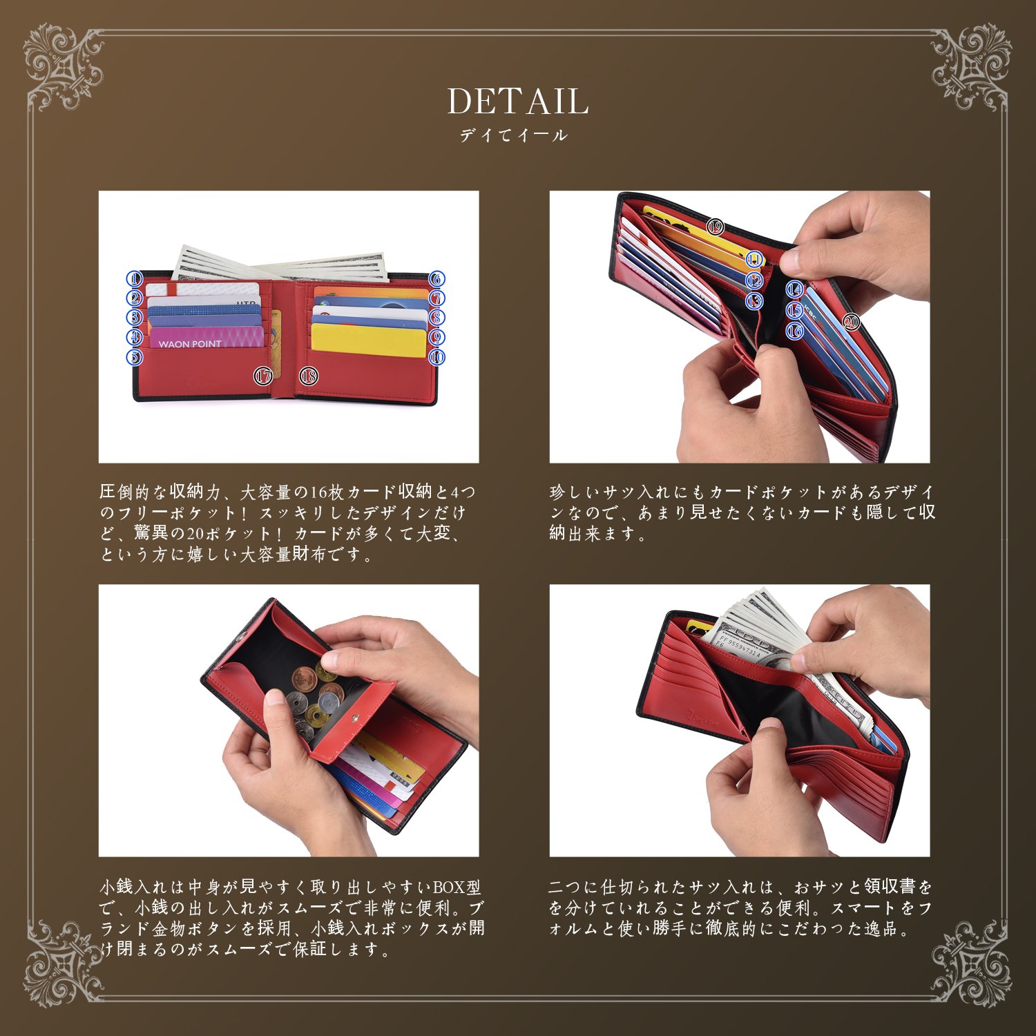 Overwhelming storage capacity, large capacity 16 card storage and 4 free pockets!