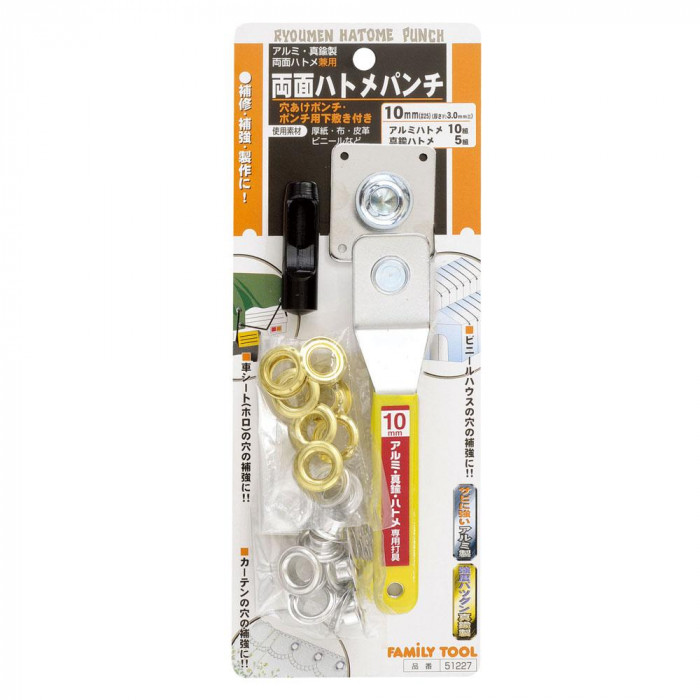 fk094igrjsシート、幌、テント、ビニールハウスの穴の補修や補強に厚紙・布・皮革・ビニール素材などにお使いいただけます サイズ 個装サイズ:3×26×10cm 重量 個装重量:200g 仕様 両面ハトメ10mm用(♯25) アルミハトメ×10組入り 真鍮ハトメ×5組入り 厚さ約3.0mmまで対応 製造国 日本 テントやシートの補修、補強に シート、幌、テント、ビニールハウスの穴の補修や補強に厚紙・布・皮革・ビニール素材などにお使いいただけます