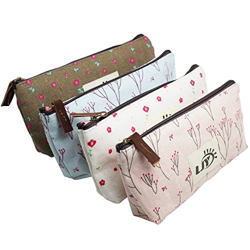 LJY Assorted Flower Floral Canvas Pen Holder Stationery Pencil Pouch Cosmetic Bags, 4 Piece