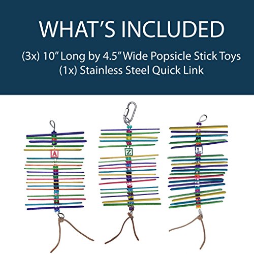 - GREAT VALUE - Includes 3 popsicle stick toys and 1 stainless steel quick link. Each toy measures 10" long and about 4.5" wide.