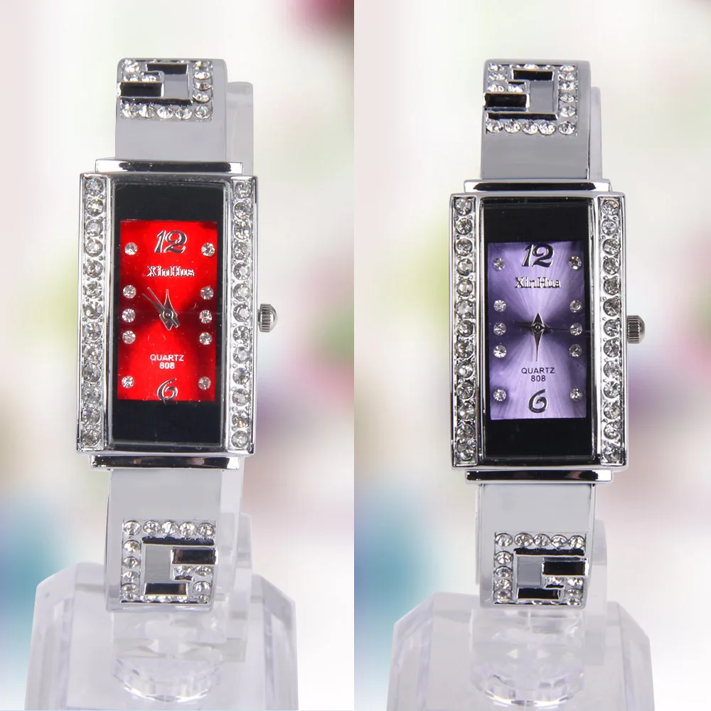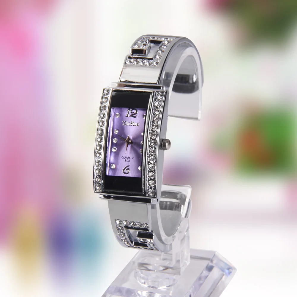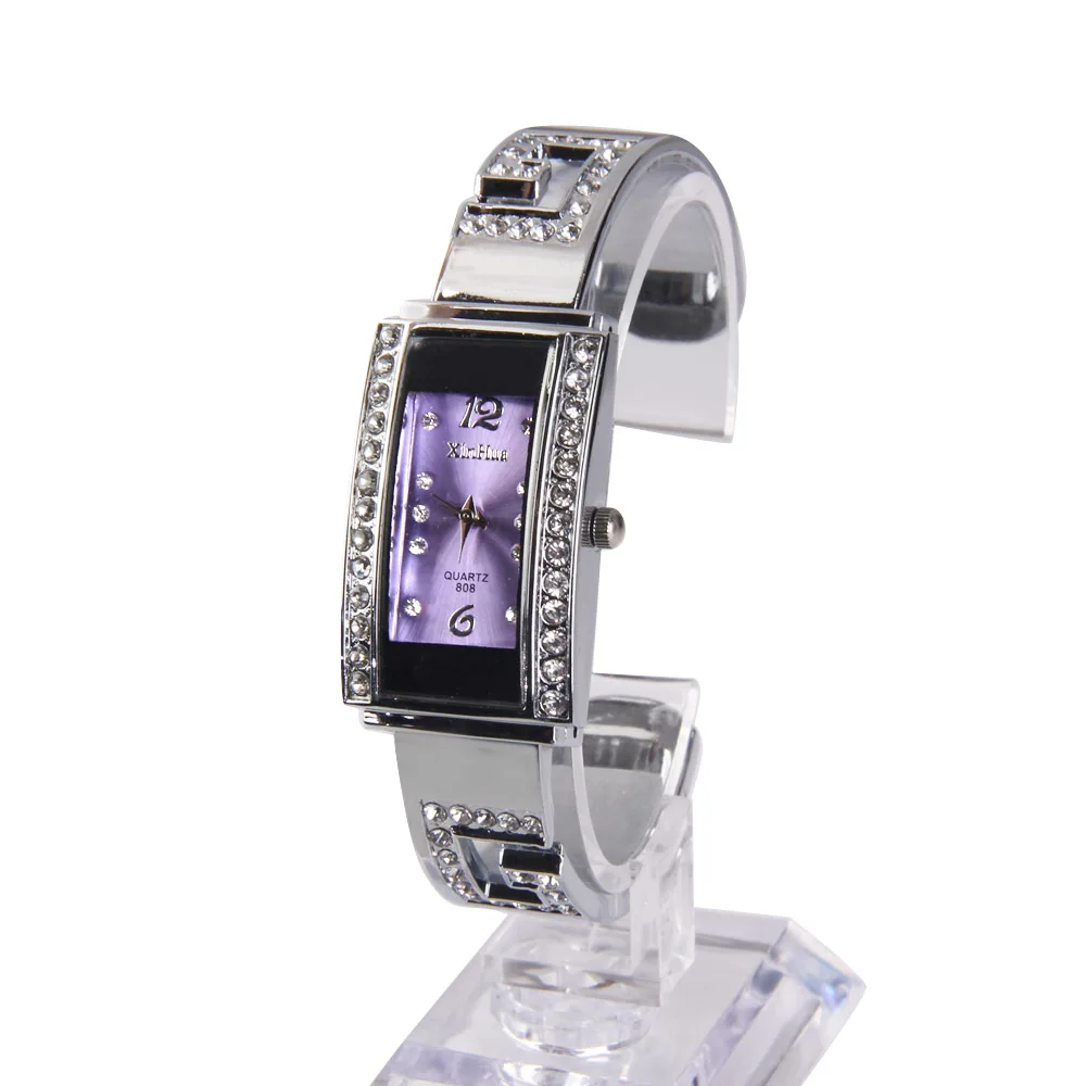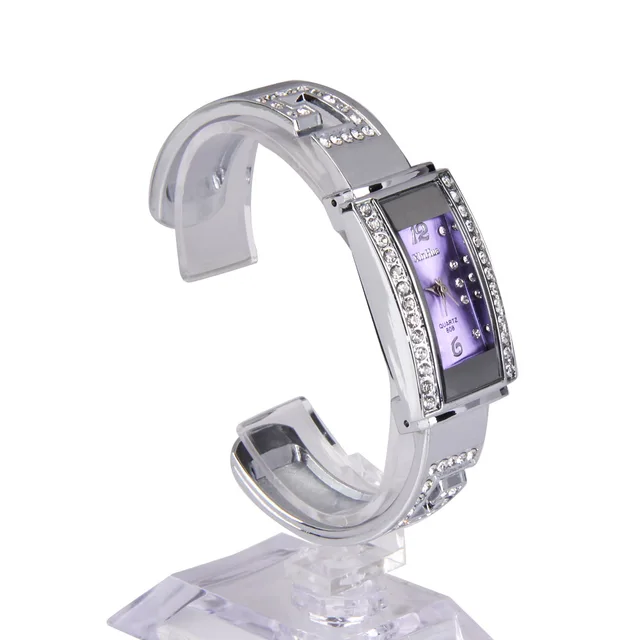 사양: 재질: 합금 + 모조 다이아몬드 디스플레이: 아날로그 운동: 석영 케이스 모양: 직사각형 성별: 여성 표면 재질: 유리 표면 밴드 사이즈: 약. 17x1.3 센치메터 케이스 크기: 4x2.1 센치메터 케이스 두께: 0.7 센치메터 밴드 색상: 실버 다이얼 색상: 보라색 빛, 레드