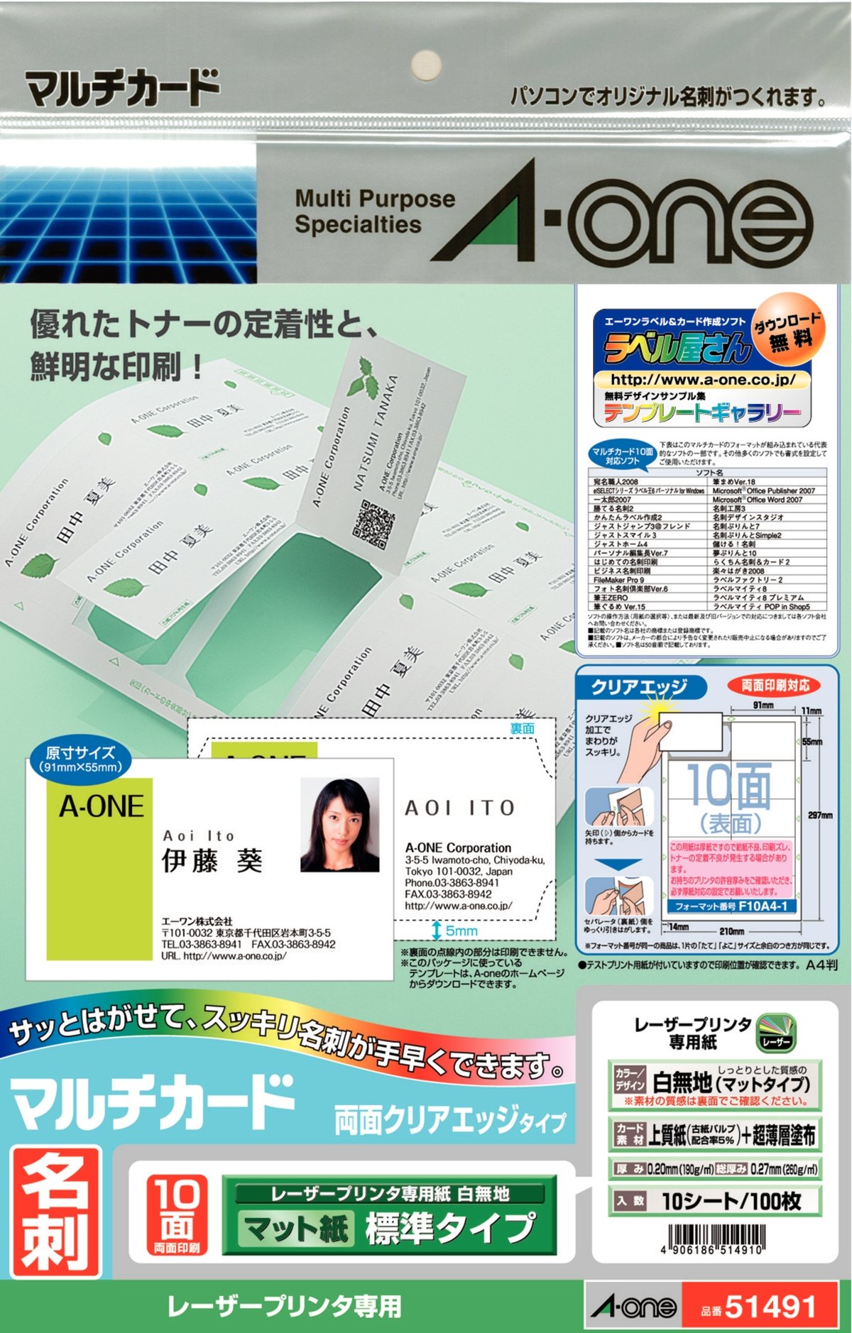 -One (A-one) multi-card laser printer special paper double-sided clear edge type plain white A4 size 10 sided business card size 10 sheets (100 sheets) 51 491 (japan import)