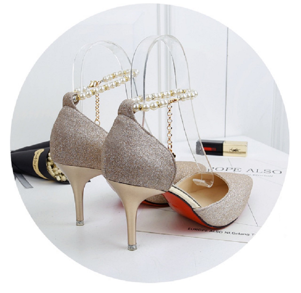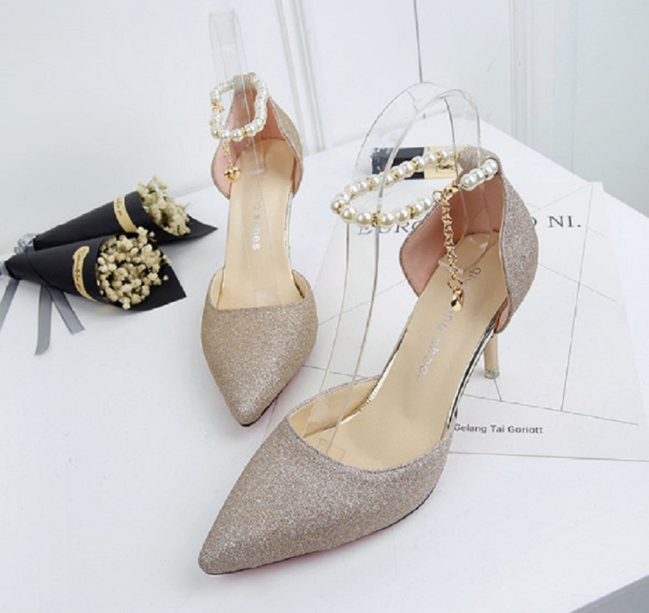 Pearl ankle strap and heart charm are adult cute pointed toe pumps.