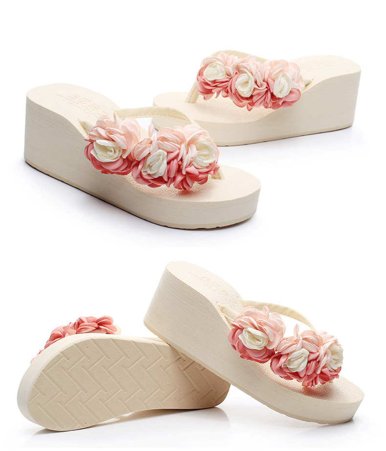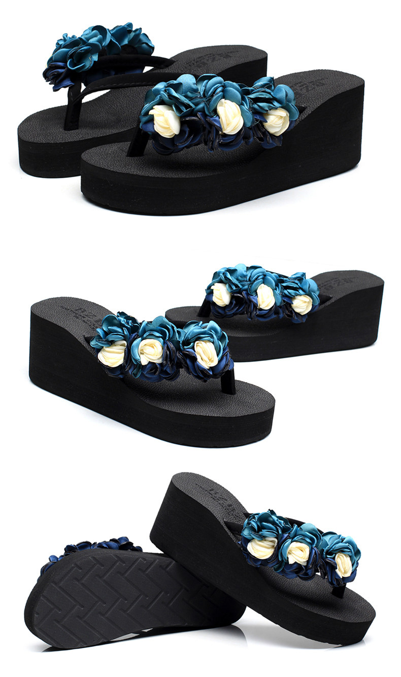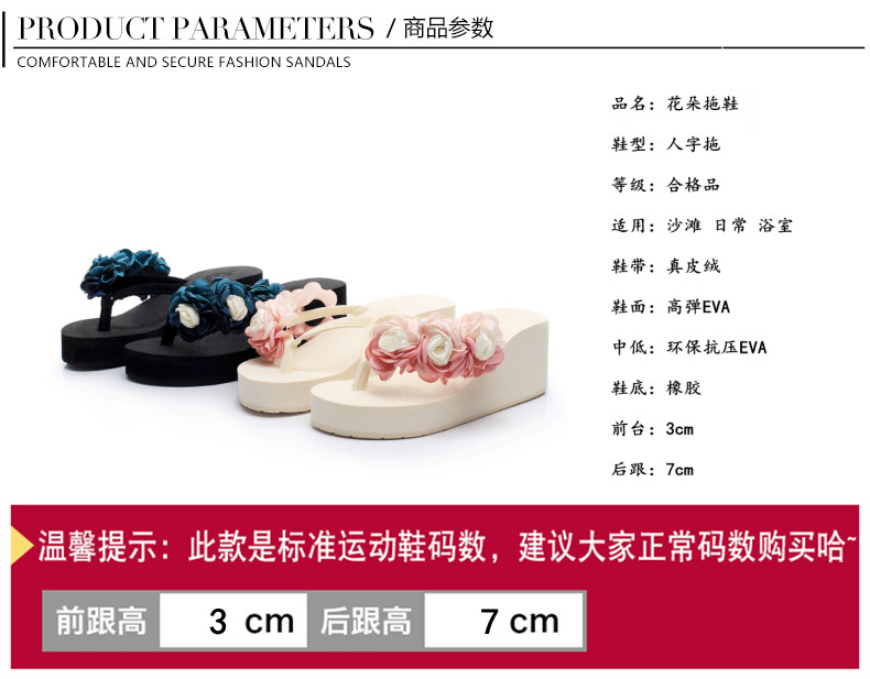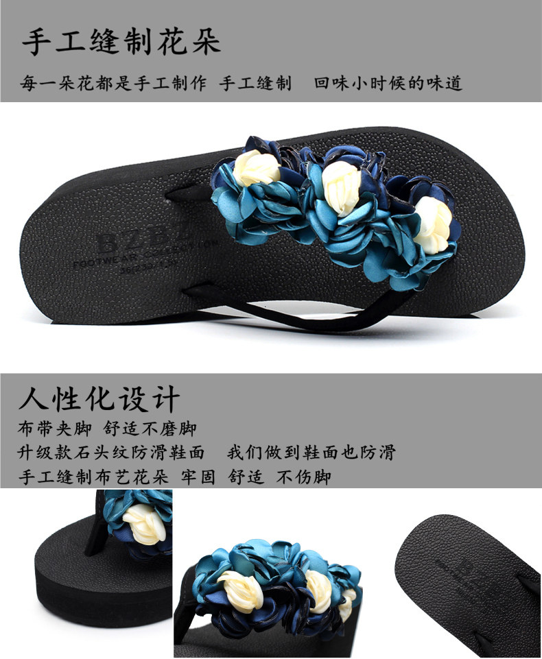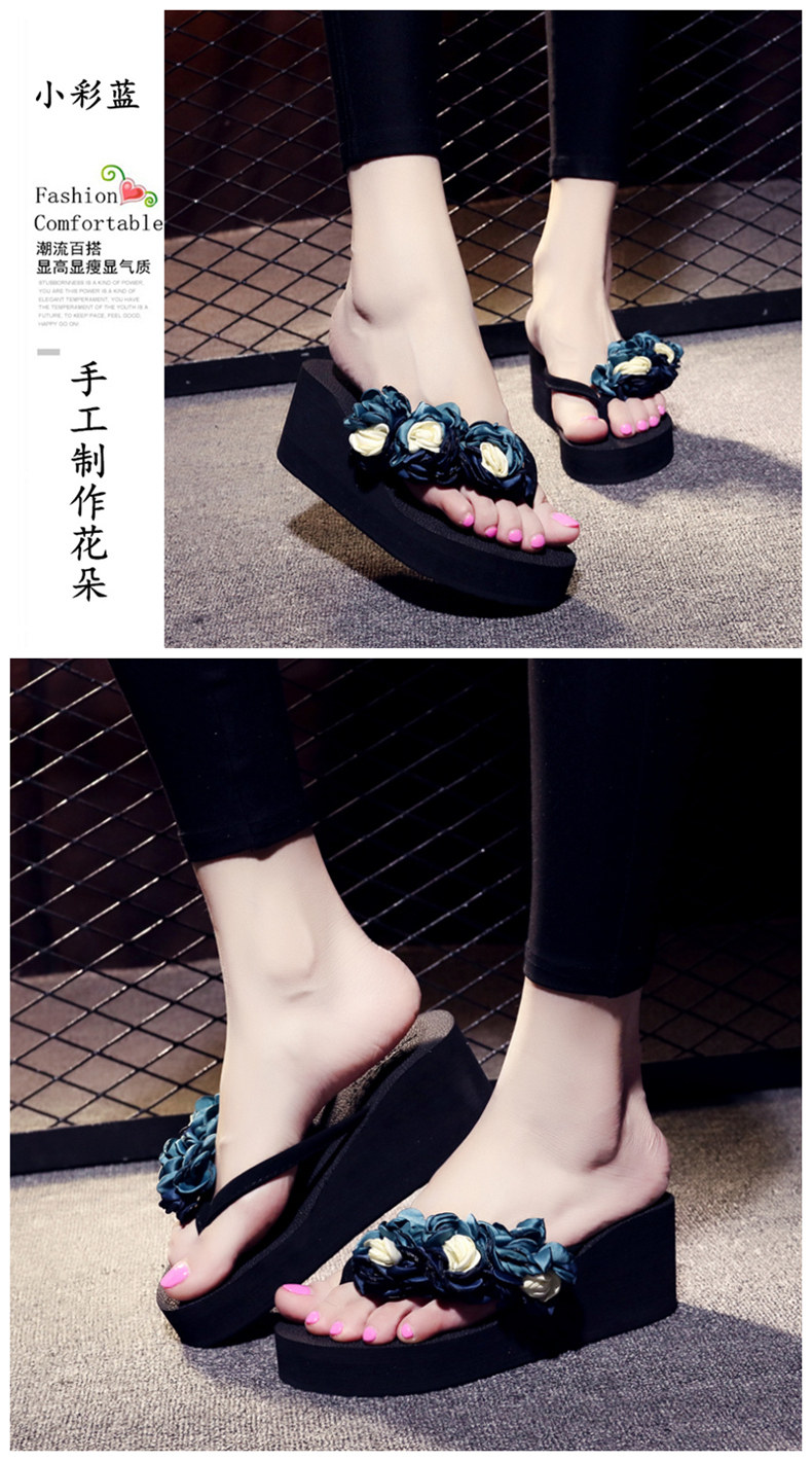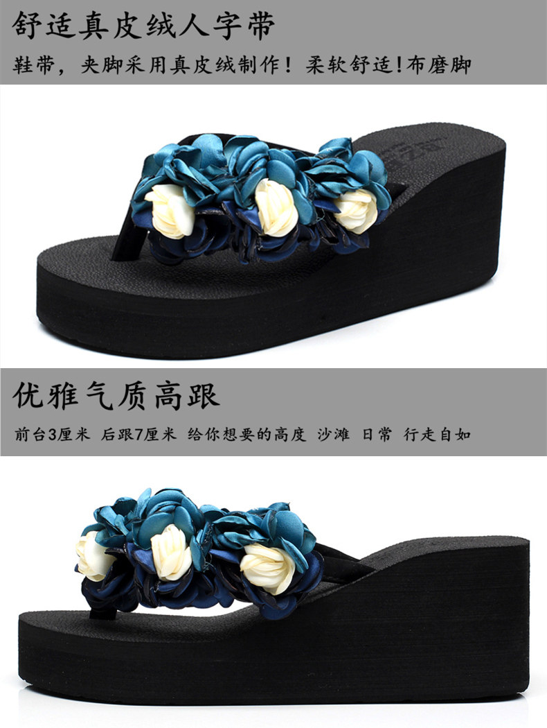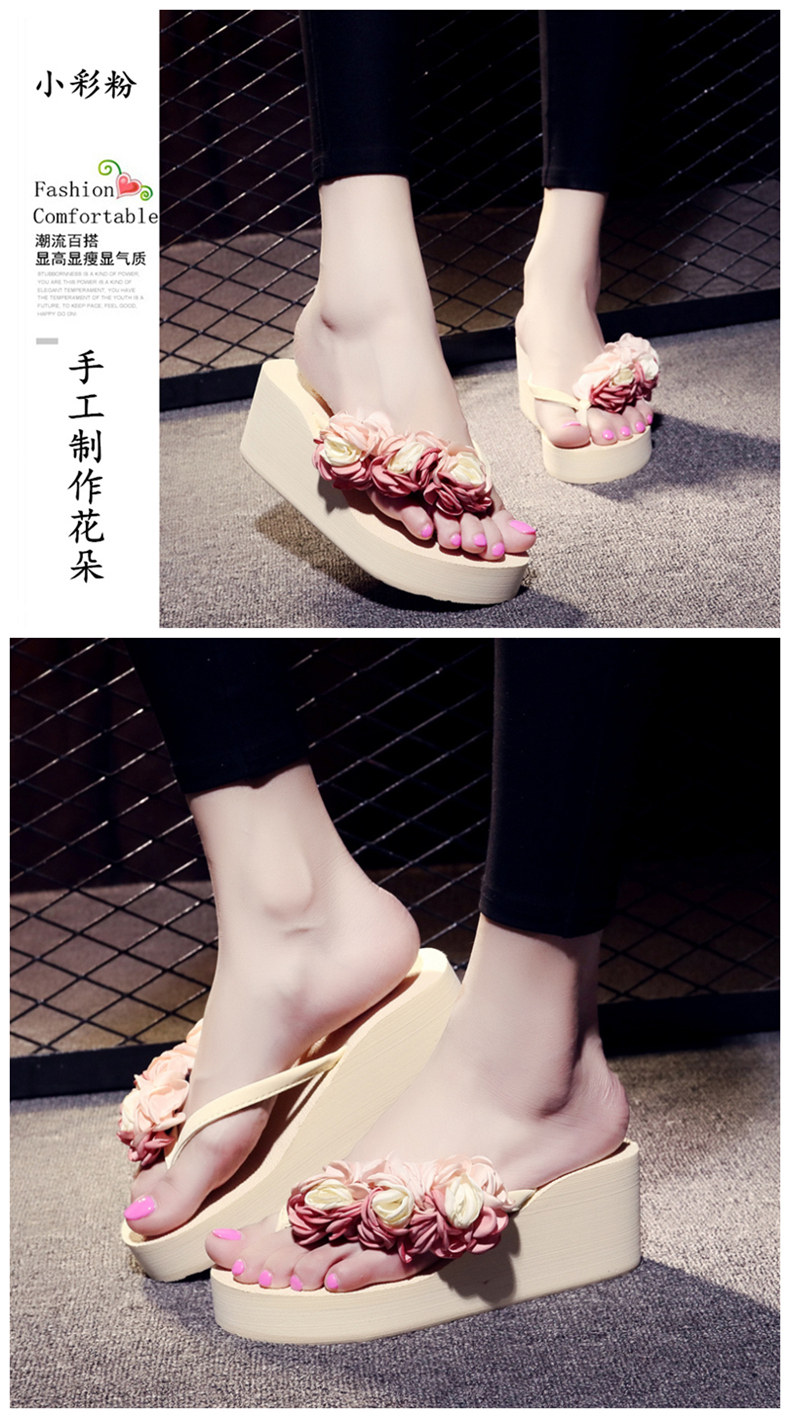 高跟人字拖鞋防滑夹脚厚底凉拖鞋女夏坡跟夹拖韩版时尚花朵沙滩鞋
