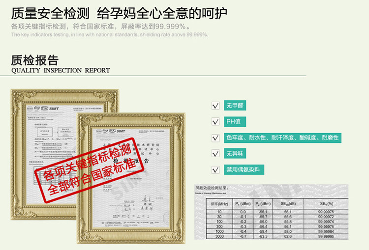 Le Minnie to perfect the professional protection for the purpose, has been adopted by the Shanghai General Administration of China certification. Quality effect of advanced, top 100 brands, the use of imported raw materials and advanced technology, you can shield 99.9% of harmful radiation. Lemei Ni advanced washing technology, fabrics can be washed directly, the correct washing methods, will not affect the protective effect of clothing.