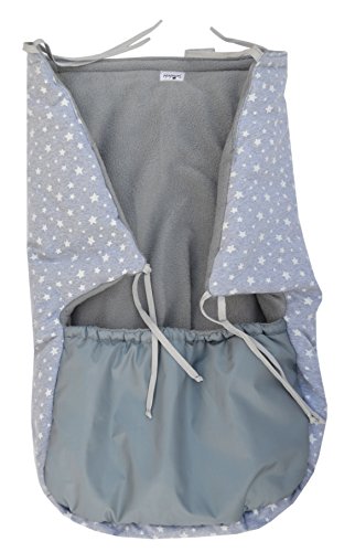 Grey fabric with White Stars pattern. The outer fabric is printed cotton wit a waterproof treatment that prevents cold air from passing through the cotton fibers. Inside, very warm fleece with an antipeeling treatment grants thermal insulation, with a filling of 2 cm layer of cotton wadding always keeps the baby warm.