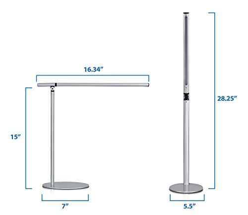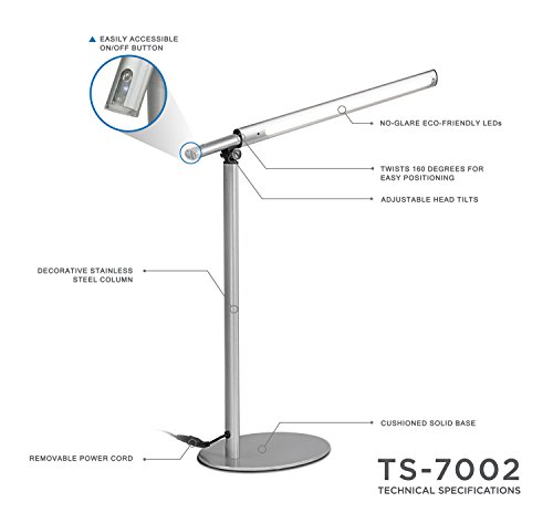 -. Feature : Natural light LED table lamp with 350 Lumen of brightness. 5500-6500 Kelvin color temperature mimics natural light. The light panel has separate LEDs to produce an even band of light that will not cast shadows or create a harsh glare / Eye-protective LED lights diffuse the beam of light for a comfortable soft exposure. Ideal settings for reading, working, studying, or relaxing. College students, offices, hotels, and bedrooms can all benefit from our stress-free technology / Adjustable neck tilts up or down and has left to right rotation for customizable positions. Our LEDs are engineered for a 20+ year lifespan. Never worry about broken bulbs again / Silver stainless steel design for contemporary appearance. Matches your room or office / Includes TS-7002 LED desk lamp, AC adapter, User Manual, 1 Year Warranty, Around the Clock Customer Support