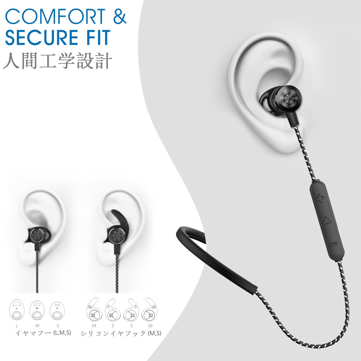 It is possible to choose two sizes of soft eared fins that fit the top of the ear, and you can firmly fix the earphone to your ear.