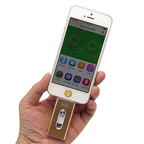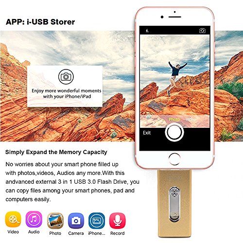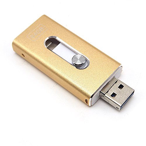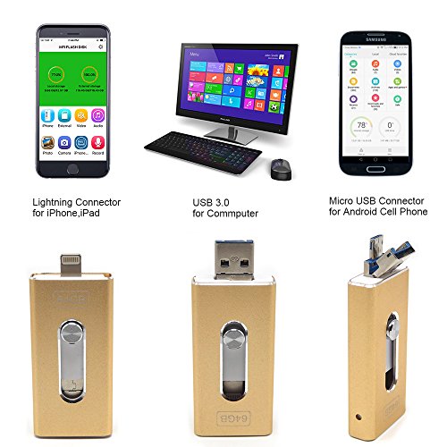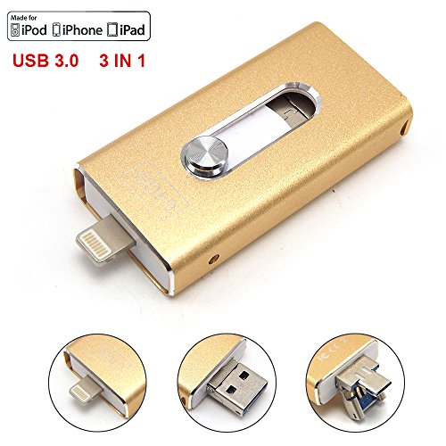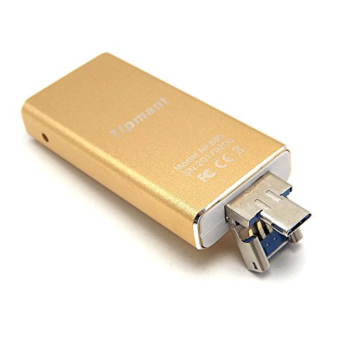 Tipmant 64GB Cell Phone USB 3.0 Flash Drives for iPhone 5 6 7 Plus, iPad OTG iOS Lightning Apple Flash Memory Stick Card Storage 3in1 - Gold