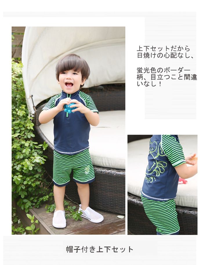 【製品仕様】■商品名子供水着 上下セット キャップ付き 男 スイムスーツ 男の子 3点セット UV対策■商品説明上下セットだから日焼けの心配なし、蛍光色のボーダー柄、目立つこと間違いなし!■素材/材質ナイロン80% スパンデックス20%■色グリーンxネイビー[検索キーワード]子供水着 セパレート 女の子 上下セット ラッシュガード キッズ スイムスーツ 男の子 キッズ水着 水着 ワンピース 女の子 上下セット タンキニ セパレートビキニ 可愛い 幼稚園 プール ビーチ 子供水着 UVカット UV対策 キャップ付き 3点セット 夏 80 90 100 110 120 130 140 150cm