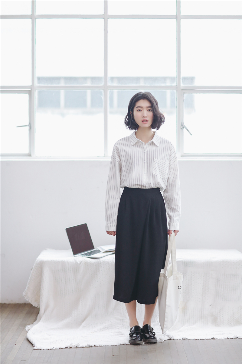 柔らかな素材が女性らしく、シンプルなデザインが大人っぽい雰囲気の長袖ストライプ柄シャツです。
